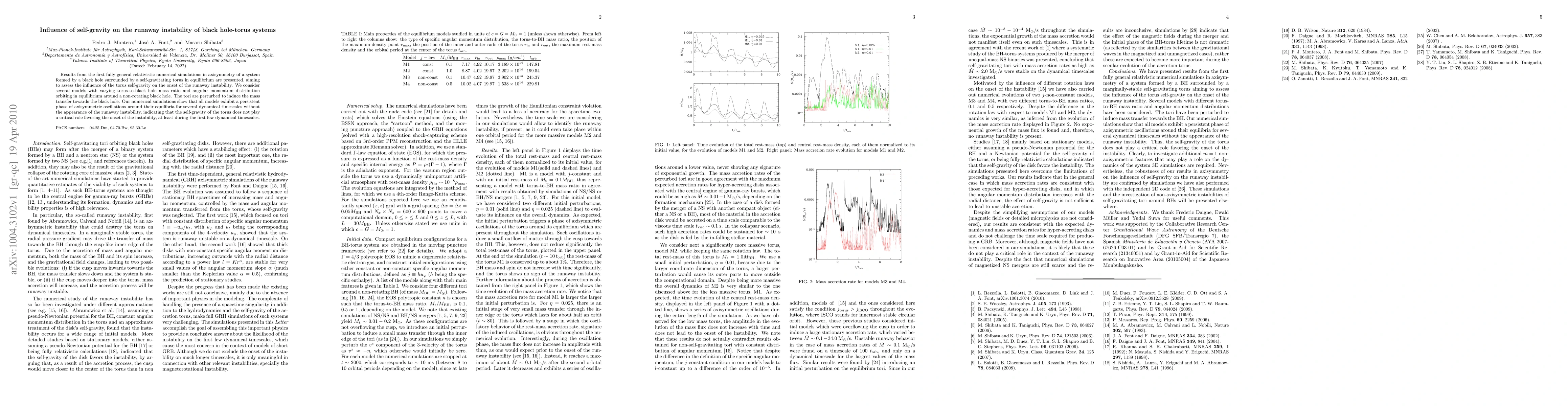 Results from the first fully general relativistic numerical simulations in axisymmetry of a system formed by a black hole surrounded by a self-gravitating torus in equilibrium are presented, aiming to assess the influence of the torus self-gravity on the onset of the runaway instability. We consider several models with varying torus-to-black hole mass ratio and angular momentum distribution orbiting in equilibrium around a non-rotating black hole. The tori are perturbed to induce the mass transfer towards the black hole. Our numerical simulations show that all models exhibit a persistent phase of axisymmetric oscillations around their equilibria for several dynamical timescales without the appearance of the runaway instability, indicating that the self-gravity of the torus does not play a critical role favoring the onset of the instability, at least during the first few dynamical timescales.