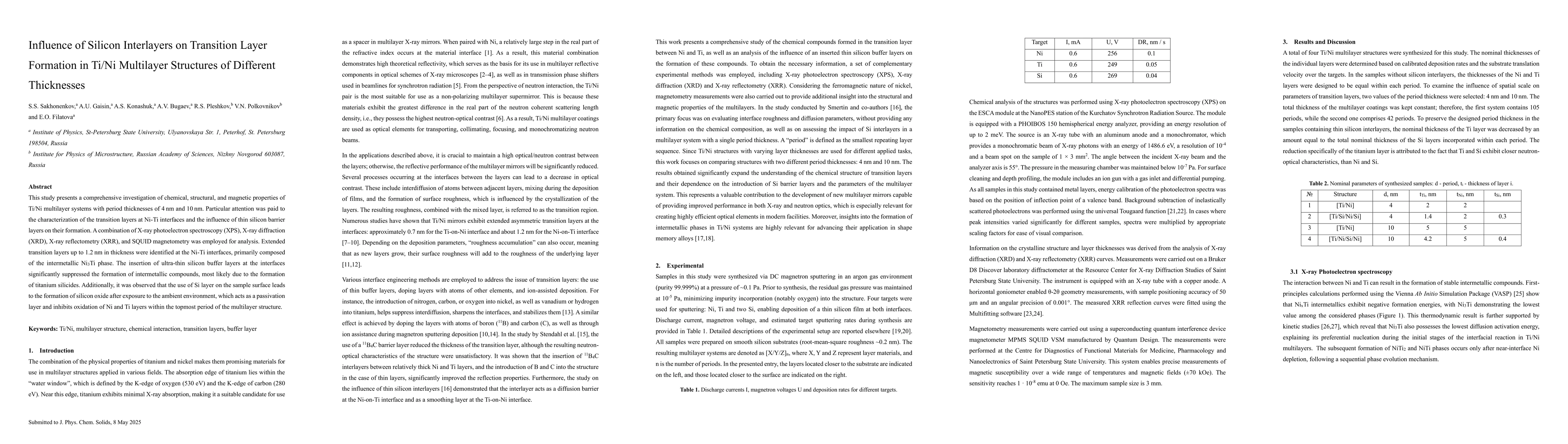 The paper presents a detailed characterization of transition layers in Ti/Ni multilayers using advanced analytical techniques and highlights the role of silicon interlayers in modifying these layers.