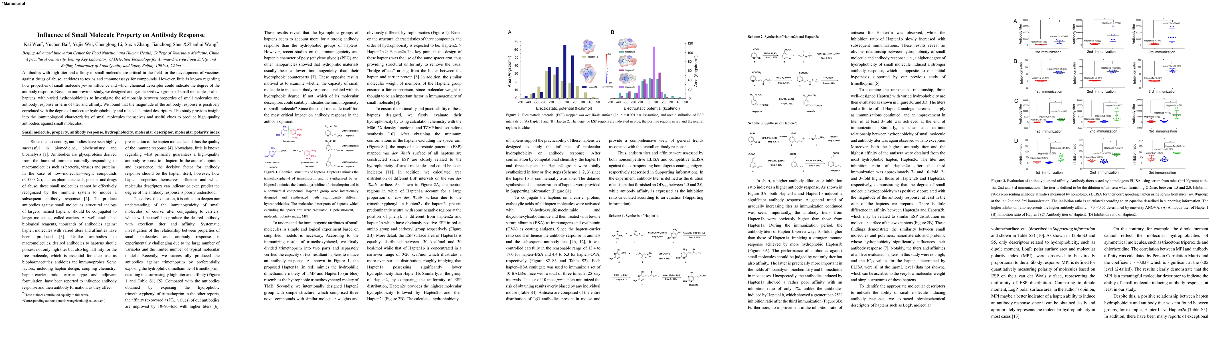 Antibodies with high titer and affinity to small molecule are critical in the field for the development of vaccines against drugs of abuse, antidotes to toxins and immunoassays for compounds. However, little is known regarding how properties of small molecule influence and which chemical descriptor could indicate the degree of the antibody response. Based on our previous study, we designed and synthesized two groups of small molecules, called haptens, with varied hydrophobicities to investigate the relationship between properties of small molecules and antibody response in term of titer and affinity. We found that the magnitude of the antibody response is positively correlated with the degree of molecular hydrophobicity and related chemical descriptors. This study provides insight into the immunological characteristics of small molecules themselves and useful clues to produce high quality antibodies against small molecules.