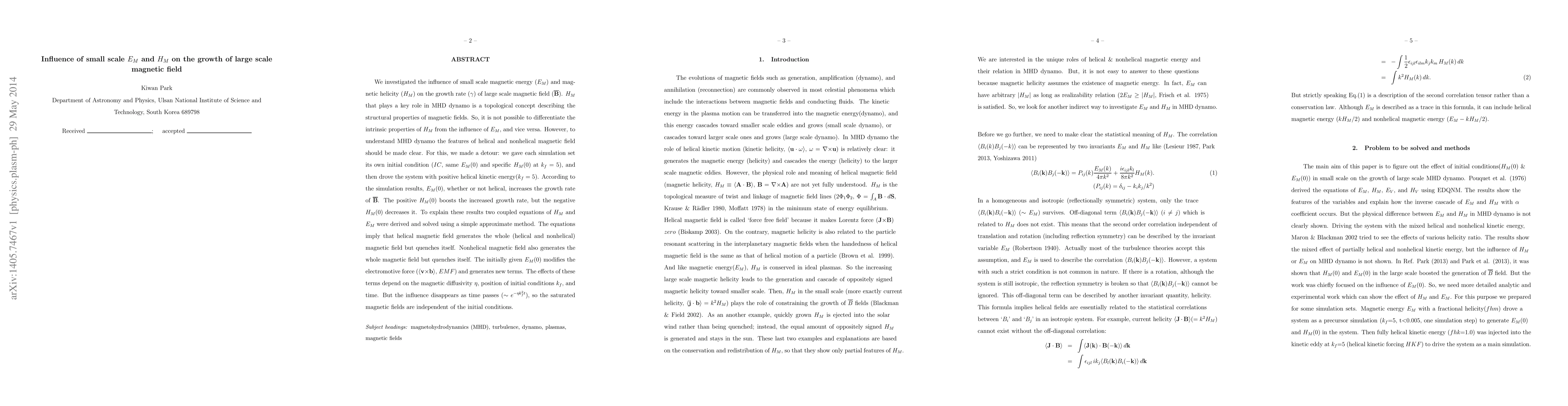 We investigated the influence of small scale magnetic energy ($E_M$) and magnetic helicity ($H_M$) on the growth rate ($\gamma$) of large scale magnetic field ($\overline{{\bf B}}$). $H_M$ that plays a key role in MHD dynamo is a topological concept describing the structural properties of magnetic fields. So, it is not possible to differentiate the intrinsic properties of $H_M$ from the influence of $E_M$, and vice versa. However, to understand MHD dynamo the features of helical and nonhelical magnetic field should be made clear. For this, we made a detour: we gave each simulation set its own initial condition ($IC$, same $E_M$(0) and specific $H_M$(0) at $k_f=5$), and then drove the system with positive helical kinetic energy($k_f=5$). According to the simulation results, $E_M$(0), whether or not helical, increases the growth rate of $\overline{{\bf B}}$. The positive $H_M$(0) boosts the increased growth rate, but the negative $H_M$(0) decreases it. To explain these results two coupled equations of $H_M$ and $E_M$ were derived and solved using a simple approximate method. The equations imply that helical magnetic field generates the whole (helical and nonhelical) magnetic field but quenches itself. Nonhelical magnetic field also generates the whole magnetic field but quenches itself. The initially given $E_M$(0) modifies the electromotive force ($\langle {\bf v}{\bf \times} {\bf b}\rangle$, $EMF$) and generates new terms. The effects of these terms depend on the magnetic diffusivity $\eta$, position of initial conditions $k_f$, and time. But the influence disappears as time passes ($\sim e^{-\eta k_f^2 t}$), so the saturated magnetic fields are independent of the initial conditions.