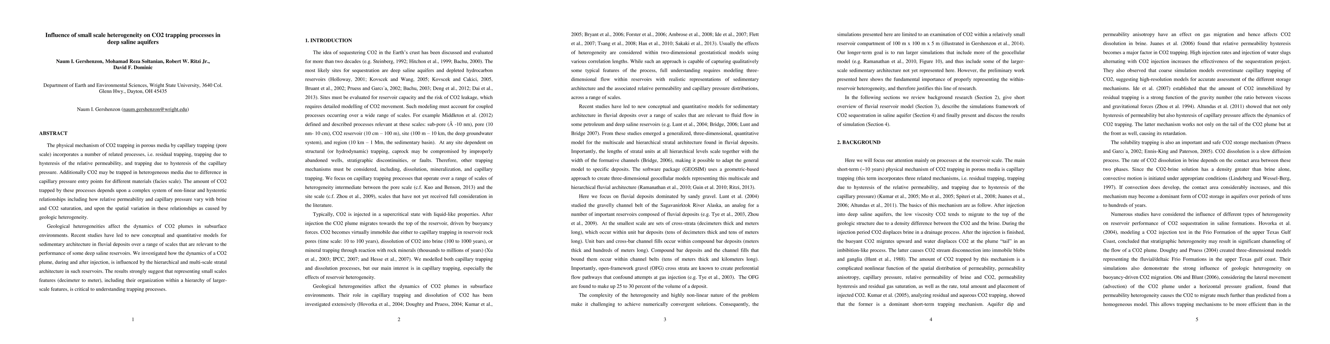 The physical mechanism of CO2 trapping in porous media by capillary trapping (pore scale) incorporates a number of related processes, i.e. residual trapping, trapping due to hysteresis of the relative permeability, and trapping due to hysteresis of the capillary pressure. Additionally CO2 may be trapped in heterogeneous media due to difference in capillary pressure entry points for different materials (facies scale). The amount of CO2 trapped by these processes depends upon a complex system of non-linear and hysteretic relationships including how relative permeability and capillary pressure vary with brine and CO2 saturation, and upon the spatial variation in these relationships as caused by geologic heterogeneity. Geological heterogeneities affect the dynamics of CO2 plumes in subsurface environments. Recent studies have led to new conceptual and quantitative models for sedimentary architecture in fluvial deposits over a range of scales that are relevant to the performance of some deep saline reservoirs. We investigated how the dynamics of a CO2 plume, during and after injection, is influenced by the hierarchical and multi-scale stratal architecture in such reservoirs. The results strongly suggest that representing small scales features (decimeter to meter), including their organization within a hierarchy of larger-scale features, is critical to understanding trapping processes.