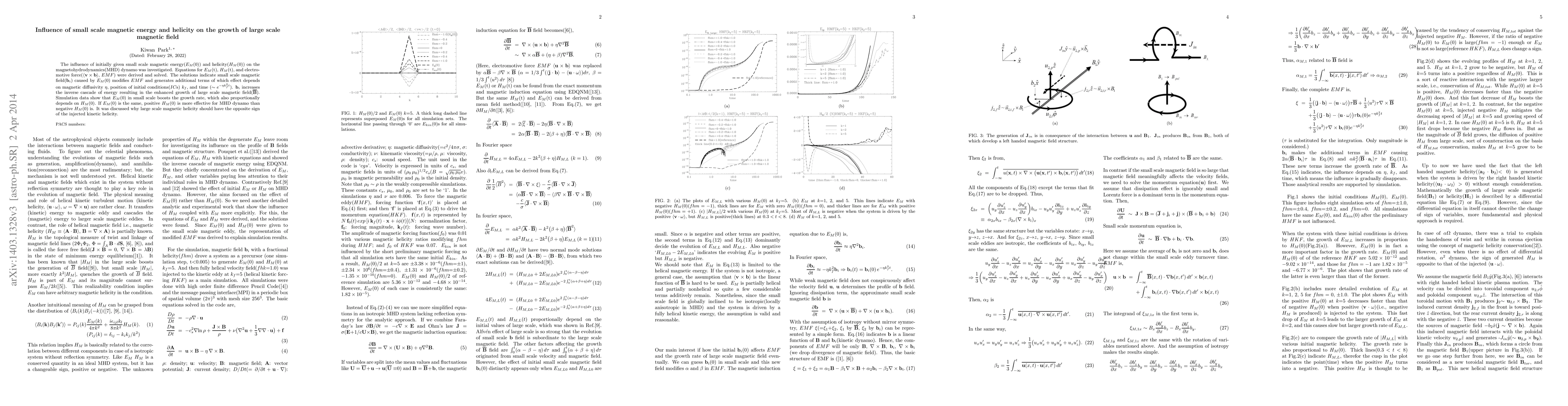 This research investigates how initial small scale magnetic energy ($E_M(0)$) and helicity ($H_M(0)$) influence the growth of large scale magnetic fields through MHD dynamo processes. The study finds that small scale magnetic fields enhance the growth rate of large scale fields, with the effect depending on magnetic diffusivity, initial conditions, and time. Positive helicity is more effective than negative for the dynamo process when initial magnetic energy is constant.