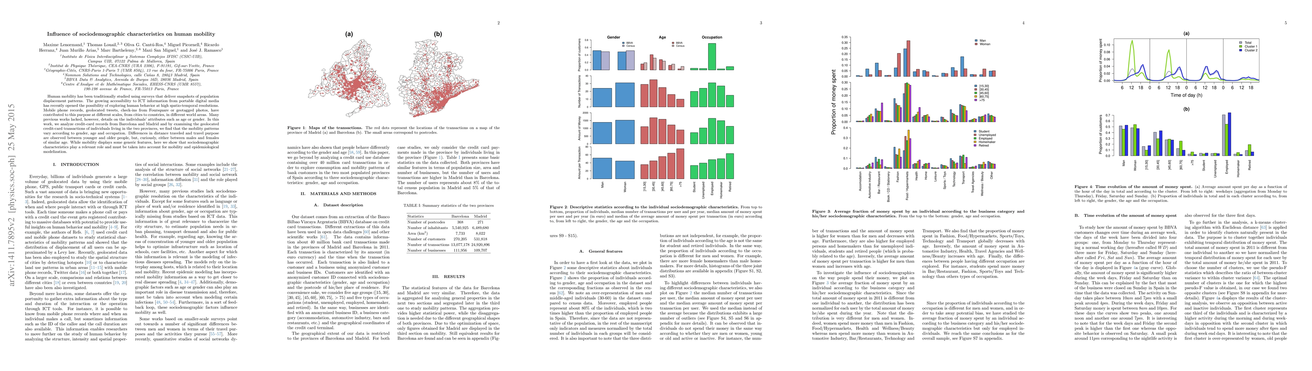 Human mobility has been traditionally studied using surveys that deliver snapshots of population displacement patterns. The growing accessibility to ICT information from portable digital media has recently opened the possibility of exploring human behavior at high spatio-temporal resolutions. Mobile phone records, geolocated tweets, check-ins from Foursquare or geotagged photos, have contributed to this purpose at different scales, from cities to countries, in different world areas. Many previous works lacked, however, details on the individuals' attributes such as age or gender. In this work, we analyze credit-card records from Barcelona and Madrid and by examining the geolocated credit-card transactions of individuals living in the two provinces, we find that the mobility patterns vary according to gender, age and occupation. Differences in distance traveled and travel purpose are observed between younger and older people, but, curiously, either between males and females of similar age. While mobility displays some generic features, here we show that sociodemographic characteristics play a relevant role and must be taken into account for mobility and epidemiological modelization.
