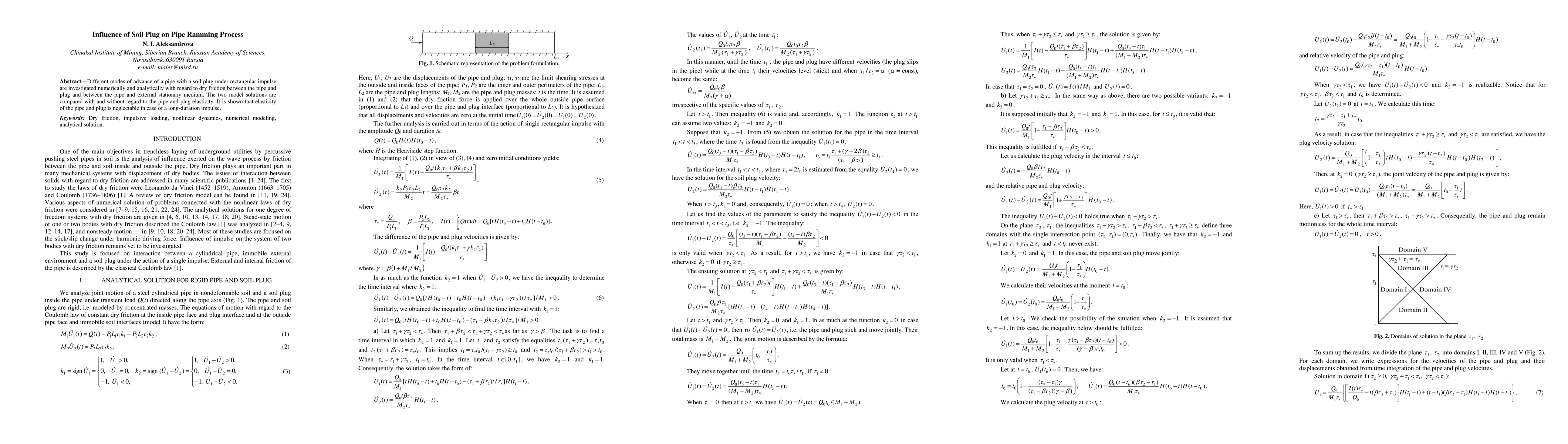 Different modes of advance of a pipe with a soil plug under rectangular impulse are investigated numerically and analytically with regard to dry friction between the pipe and plug and between the pipe and external stationary medium. The two model solutions are compared with and without regard to the pipe and plug elasticity. It is shown that elasticity of the pipe and plug is neglectable in case of a long-duration impulse.