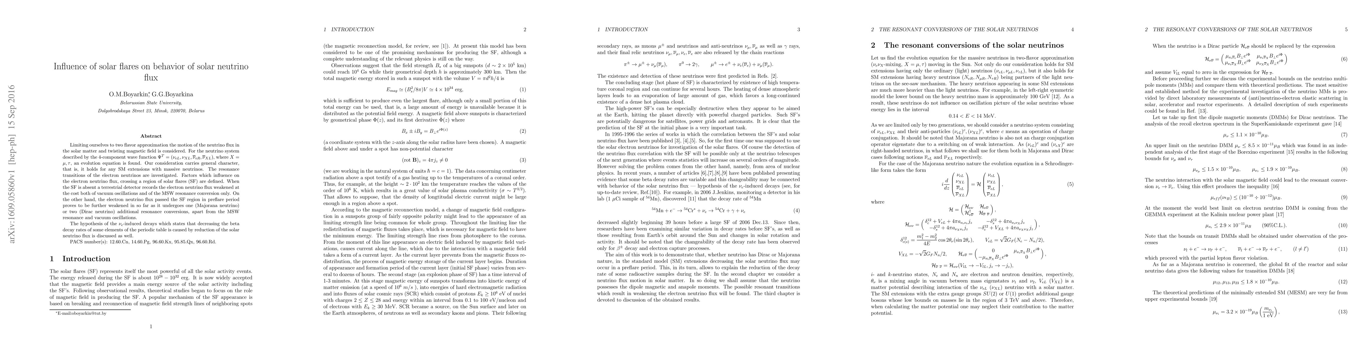 This paper explores the impact of solar flares on the behavior of solar neutrino flux, focusing on resonance transitions in the presence of solar matter and magnetic fields. It finds that solar flares can cause additional resonance conversions, further weakening the electron neutrino flux detected on Earth, and discusses the implications for the hypothesis linking reduced solar neutrino flux to decreased beta decay rates.