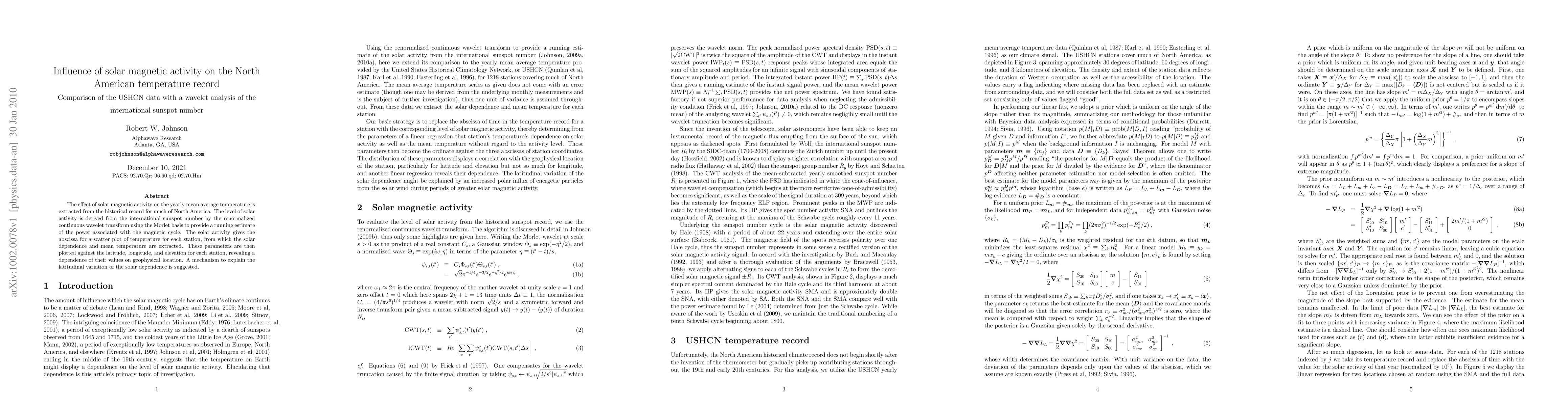 This study investigates the influence of solar magnetic activity on North American temperature records using historical data. It employs a renormalized continuous wavelet transform to analyze sunspot numbers and correlates these findings with yearly mean temperatures, revealing a dependency on geographical factors such as latitude, longitude, and elevation.