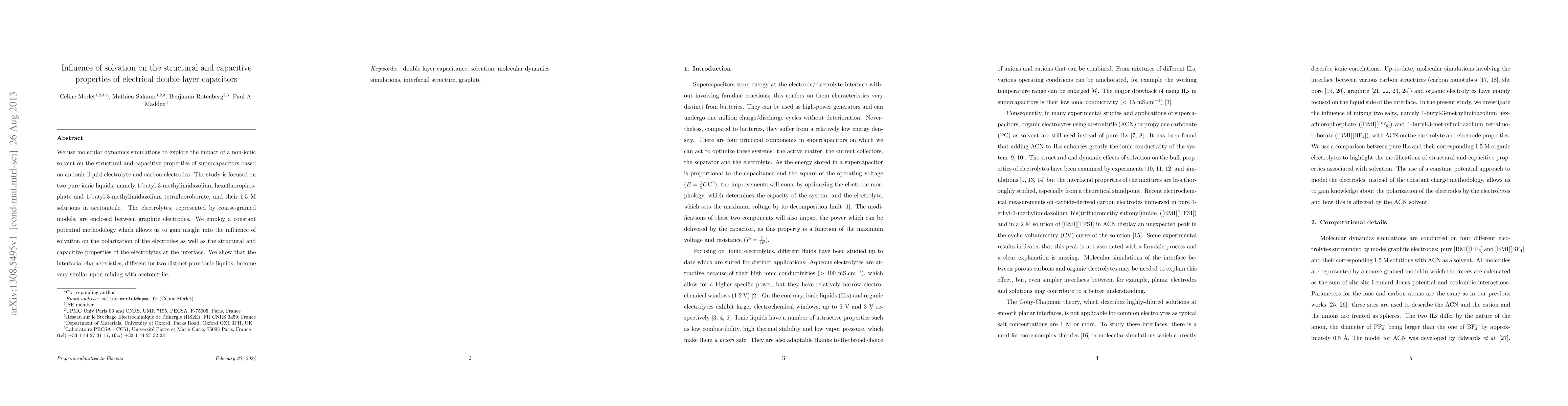 Molecular dynamics simulations were employed to investigate the influence of non-ionic solvent acetonitrile (ACN) on the structural and capacitive properties of supercapacitors using ionic liquid electrolytes and carbon electrodes. The study focused on two pure ionic liquids, 1-butyl-3-methylimidazolium hexafluorophosphate and 1-butyl-3-methylimidazolium tetrafluoroborate, and their 1.5 M solutions in ACN, represented by coarse-grained models enclosed between graphite electrodes.
