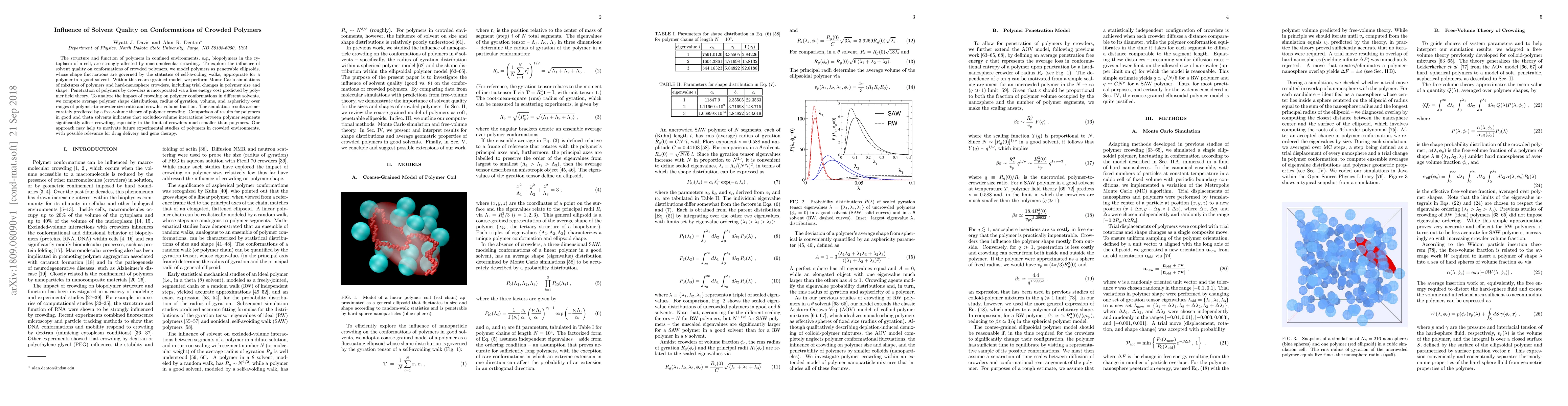 This paper investigates how solvent quality influences polymer conformations in crowded environments, using Monte Carlo simulations of polymers modeled as penetrable ellipsoids. The study reveals that excluded-volume interactions significantly affect polymer shapes in crowded conditions, especially when crowders are much smaller than polymers, with implications for drug delivery and gene therapy.