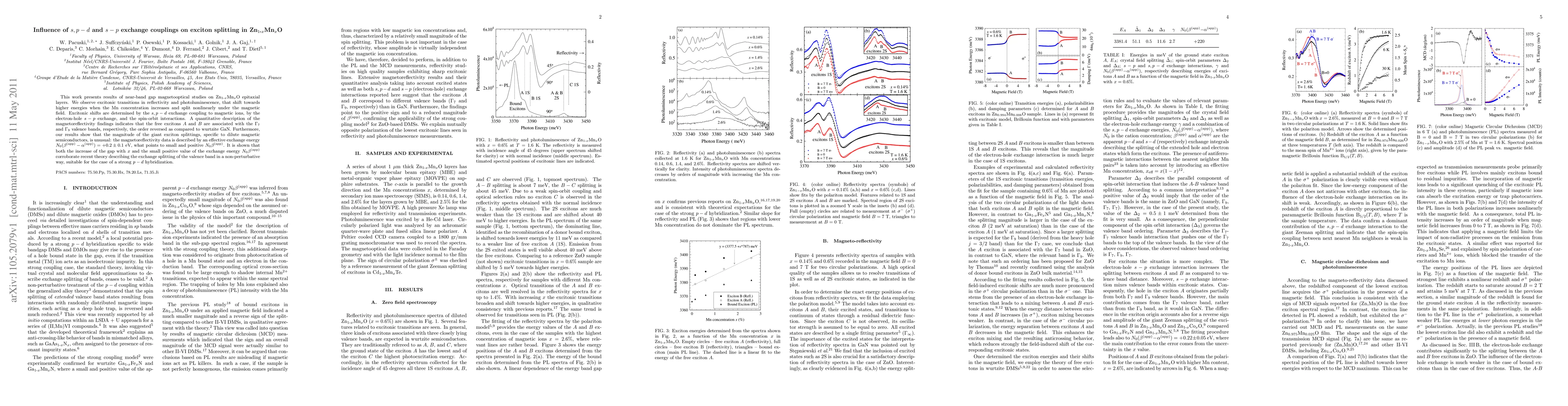 This work presents results of near-band gap magnetooptical studies on (Zn,Mn)O epitaxial layers. We observe excitonic transitions in reflectivity and photoluminescence, that shift towards higher energies when the Mn concentration increases and split nonlinearly under the magnetic field. Excitonic shifts are determined by the s,p-d exchange coupling to magnetic ions, by the electron-hole s-p exchange, and the spin-orbit interactions. A quantitative description of the magnetoreflectivity findings indicates that the free excitons A and B are associated with the Gamma_7 and Gamma_9 valence bands, respectively, the order reversed as compared to wurtzite GaN. Furthermore, our results show that the magnitude of the giant exciton splittings, specific to dilute magnetic semiconductors, is unusual: the magnetoreflectivity data is described by an effective exchange energy N_0(beta-alpha)=+0.2+/-0.1 eV, what points to small and positive N_0 beta. It is shown that both the increase of the gap with x and the small positive value of the exchange energy N_0 beta corroborate recent theory describing the exchange splitting of the valence band in a non-perturbative way, suitable for the case of a strong p-d hybridization.