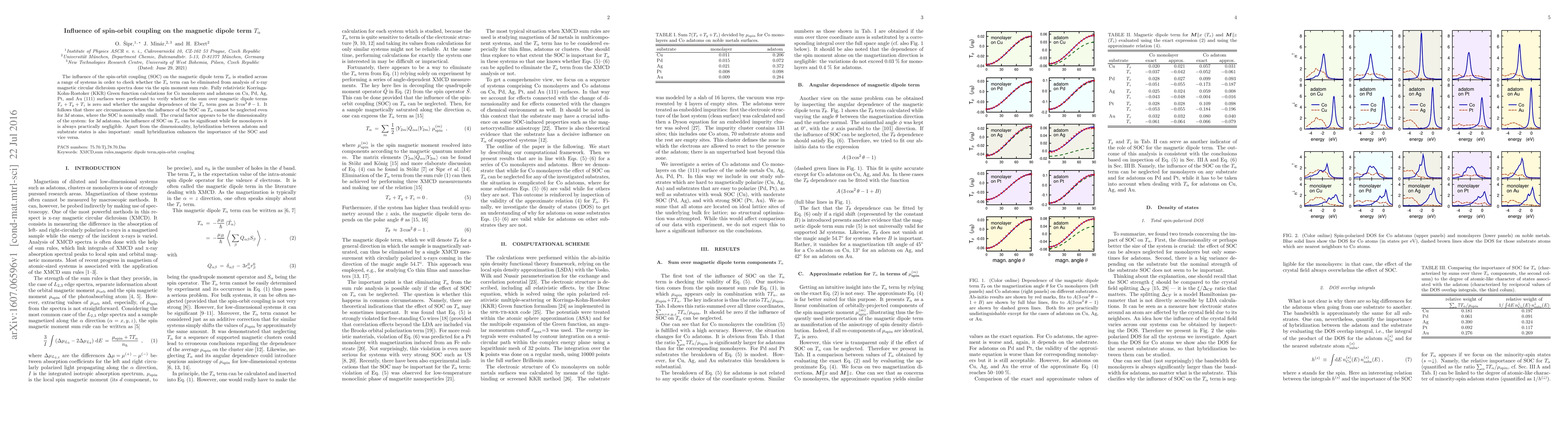 The influence of the spin-orbit coupling (SOC) on the magnetic dipole term $T_{\alpha}$ is studied across a range of systems in order to check whether the $T_{\alpha}$ term can be eliminated from analysis of x-ray magnetic circular dichroism spectra done via the spin moment sum rule. Fully relativistic Korringa-Kohn-Rostoker (KKR) Green function calculations for Co monolayers and adatoms on Cu, Pd, Ag, Pt, and Au (111) surfaces were performed to verify whether the sum over magnetic dipole terms $T_{x}+T_{y}+T_{z}$ is zero and whether the angular dependence of the \ta\ term goes as $3\cos^{2}\theta-1$. It follows that there are circumstances when the influence of the SOC on $T_{\alpha}$ cannot be neglected even for 3$d$ atoms, where the SOC is nominally small. The crucial factor appears to be the dimensionality of the system: for 3$d$ adatoms, the influence of SOC on $T_{\alpha}$ can be significant while for monolayers it is always practically negligible. Apart from the dimensionality, hybridization between adatom and substrate states is also important: small hybridization enhances the importance of the SOC and vice versa.