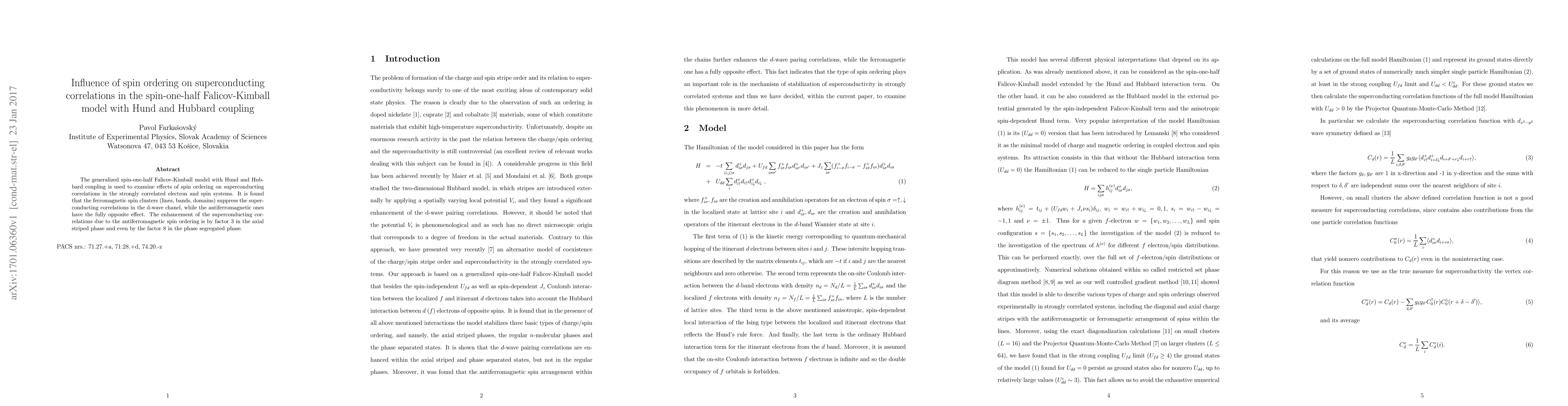 This paper investigates the impact of spin ordering on superconducting correlations in the spin-one-half Falicov-Kimball model with Hund and Hubbard coupling, revealing that ferromagnetic spin clusters suppress d-wave superconducting correlations, while antiferromagnetic spin ordering enhances them, with significant amplification in striped and phase segregated phases.