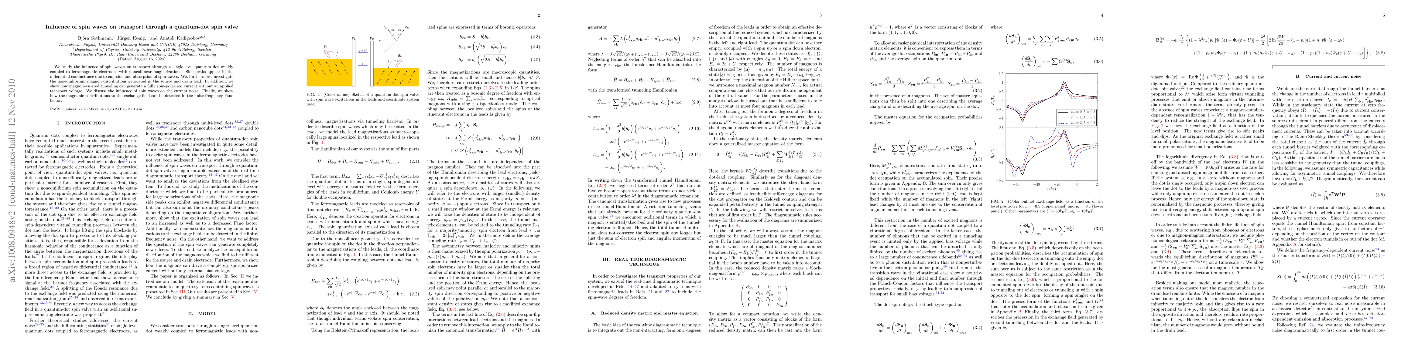 This paper investigates the impact of spin waves on transport in a quantum-dot spin valve, revealing side peaks in differential conductance due to spin wave emission and absorption. It also explores magnon-assisted tunneling generating fully spin-polarized current and the influence of spin waves on current noise, with detection of magnonic contributions via the finite-frequency Fano factor.