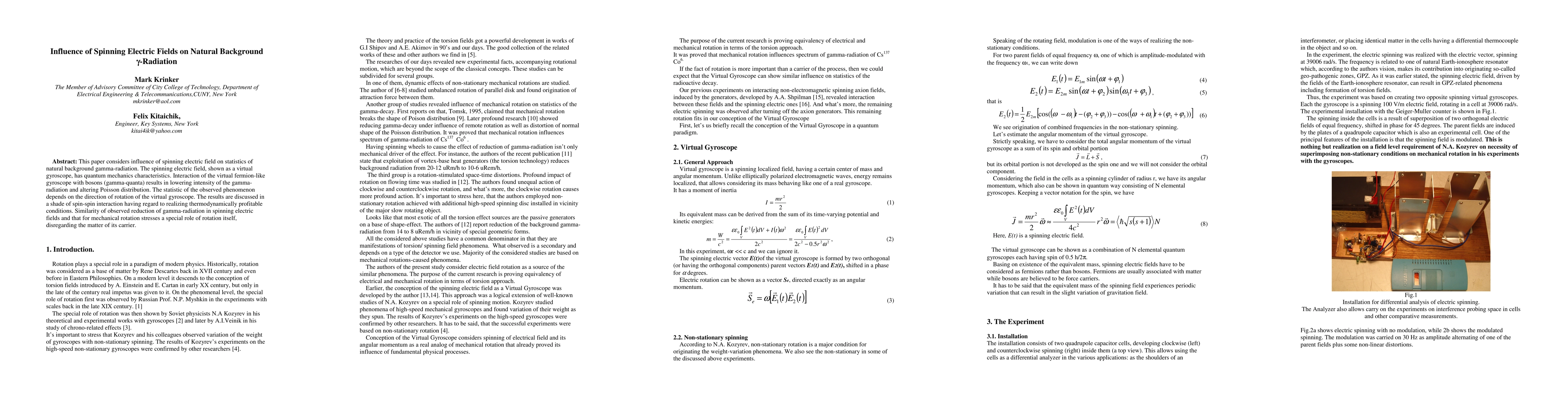 This paper investigates how spinning electric fields affect natural background gamma-radiation, revealing a reduction in gamma-radiation intensity and altered Poisson distribution due to the interaction of a virtual gyroscope with gamma-quanta. The observed effects are direction-dependent and suggest a significant role of rotation itself.