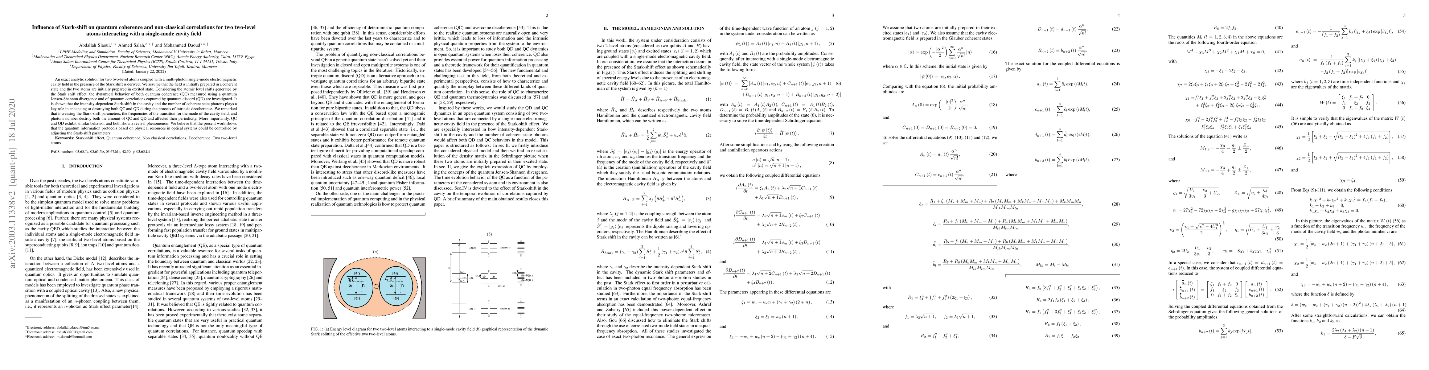 An exact analytic solution for two two-level atoms coupled with a multi-photon single-mode electromagnetic cavity field in the presence of the Stark shift is derived. We assume that the field is initially prepared in a coherent state and the two atoms are initially prepared in an excited state. Considering the atomic level shifts generated by the Stark shift effect, the dynamical behavior of both quantum coherence (QC) measured using a quantum Jensen-Shannon divergence and of quantum correlations captured by quantum discord (QD) are investigated. It is shown that the intensity-dependent Stark-shift in the cavity and the number of coherent state photons plays a key role in enhancing or destroying both QC and QD during the process of intrinsic decoherence. We remarked that increasing the Stark-shift parameters, the frequencies of the transition for the mode of the cavity field, and photons number destroy both the amount of QC and QD and effected their periodicity. More importantly, QC and QD exhibit similar behavior and both show a revival phenomenon. We believe that the present work shows that the quantum information protocols based on physical resources in optical systems could be controlled by adjusting the Stark-shift parameters.