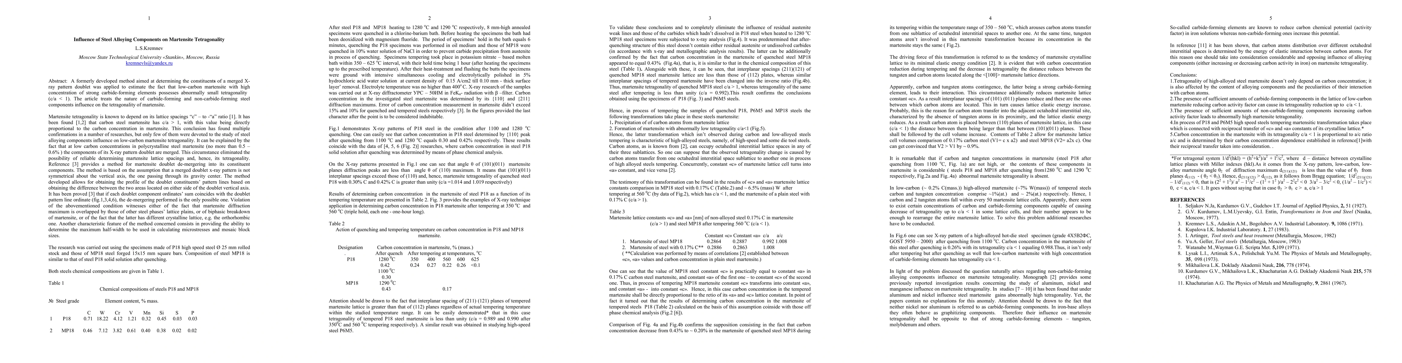 A formerly developed method aimed at determining the constituents of a merged X-ray pattern doublet was applied to estimate the fact that low-carbon martensite with high concentration of strong carbide-forming elements possesses abnormally small tetragonality(c/a < 1). The article treats the nature of carbide-forming and non-carbide-forming steel components influence on the tetragonality of martensite.