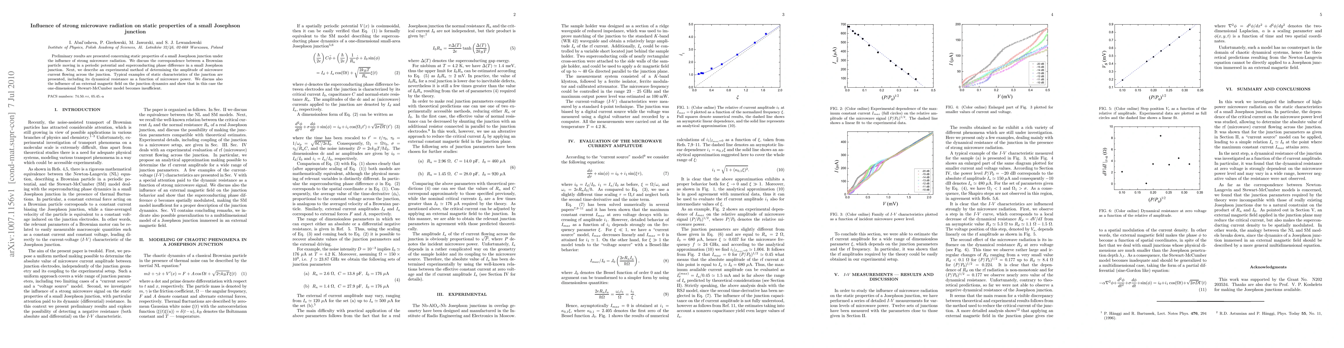 Preliminary results are presented concerning static properties of a small Josephson junction under the influence of strong microwave radiation. We discuss the correspondence between a Brownian particle moving in a periodic potential and superconducting phase difference in a small Josephson junction. Next, we describe an experimental method of determining the amplitude of microwave current flowing across the junction. Typical examples of static characteristics of the junction are presented, including its dynamical resistance as a function of microwave power. We discuss also the influence of an external magnetic field on the junction dynamics and show that in this case the one-dimensional Stewart-McCumber model becomes insufficient.