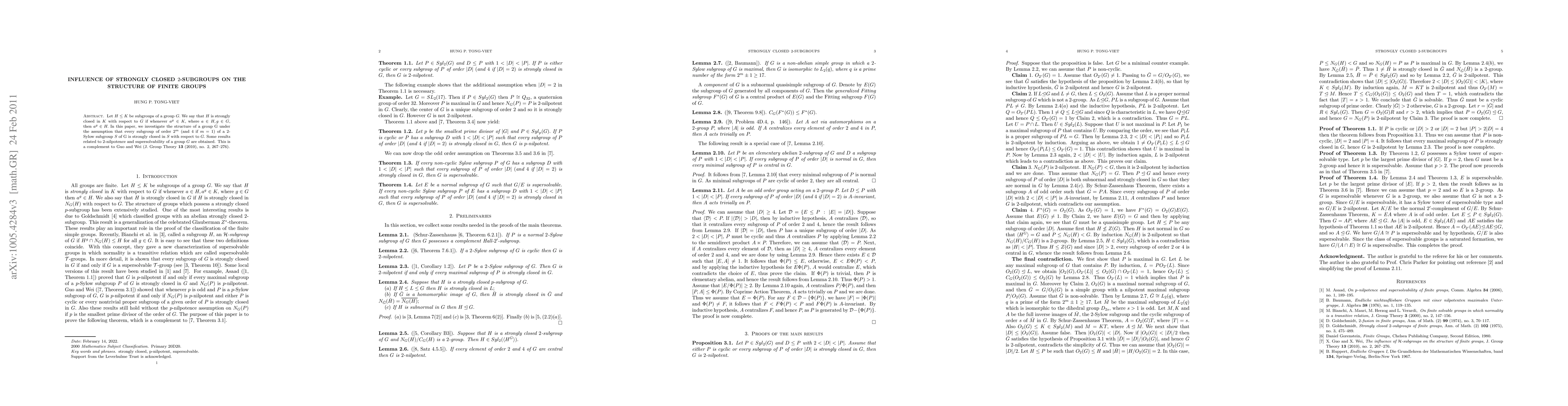 This research explores how strongly closed 2-subgroups within a group's 2-Sylow subgroup impact the group's structure. Findings relate to 2-nilpotence and supersolvability, expanding on previous work by Guo and Wei.