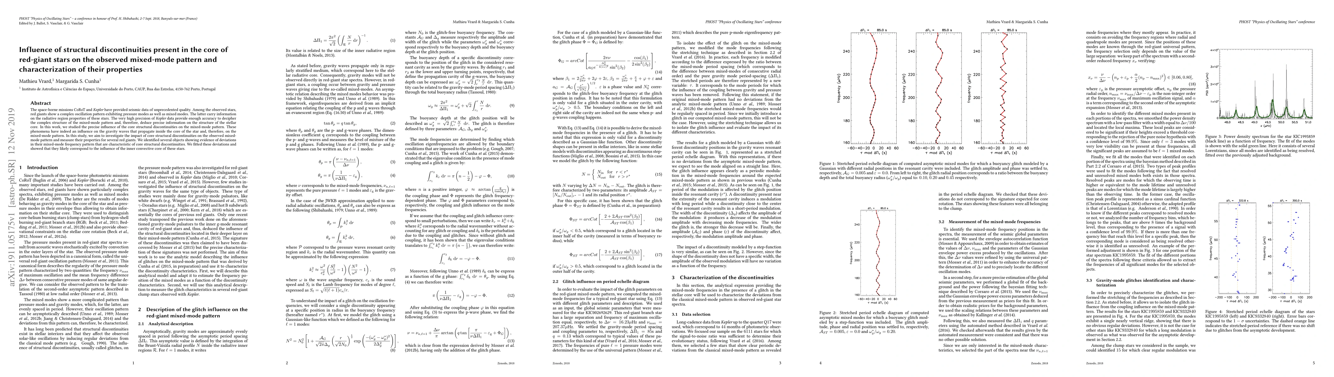The space-borne missions CoRoT and Kepler have provided seismic data of unprecedented quality. Among the observed stars, red giants show a complex oscillation pattern exhibiting pressure modes as well as mixed modes. The latter carry information on the radiative region properties of these stars. The very high precision of Kepler data provide enough accuracy to decipher the complex structure of the mixed-mode pattern and, therefore, deduce precise information on the structure of the stellar core. In this work, we studied the precise influence of the core structural discontinuities on the mixed-mode pattern. These phenomena have indeed an influence on the gravity waves that propagate inside the core of the star and, therefore, on the mixed-mode pattern. In this study, we aim to investigate the impact of core structural discontinuities on the observed mixed-mode pattern and measure their properties for several red giants. We identified several objects showing evidence of deviations in their mixed-mode frequency pattern that are characteristic of core structural discontinuities. We fitted these deviations and showed that they likely correspond to the influence of the inner convective core of these stars.