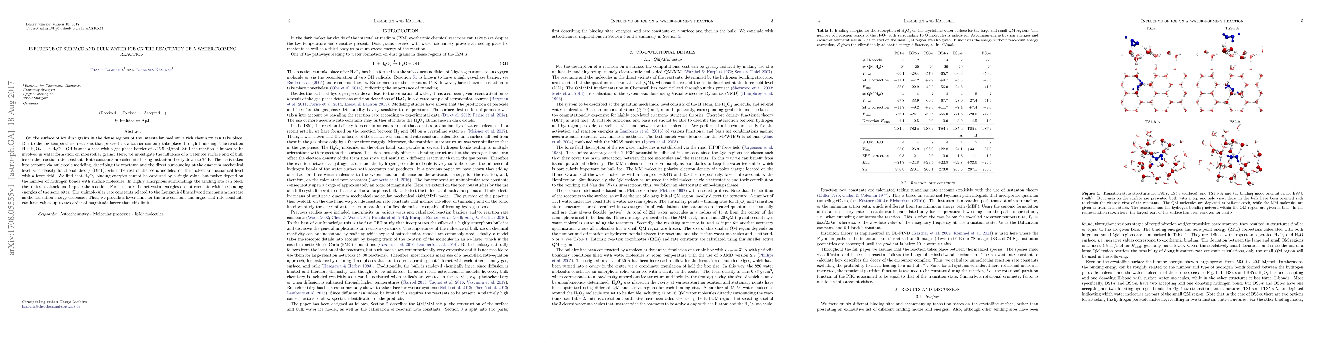Researchers studied how surface and bulk water ice affect a key reaction in interstellar medium chemistry, finding that binding energies depend on hydrogen bonds with surface molecules and activation energies don't correlate with them.