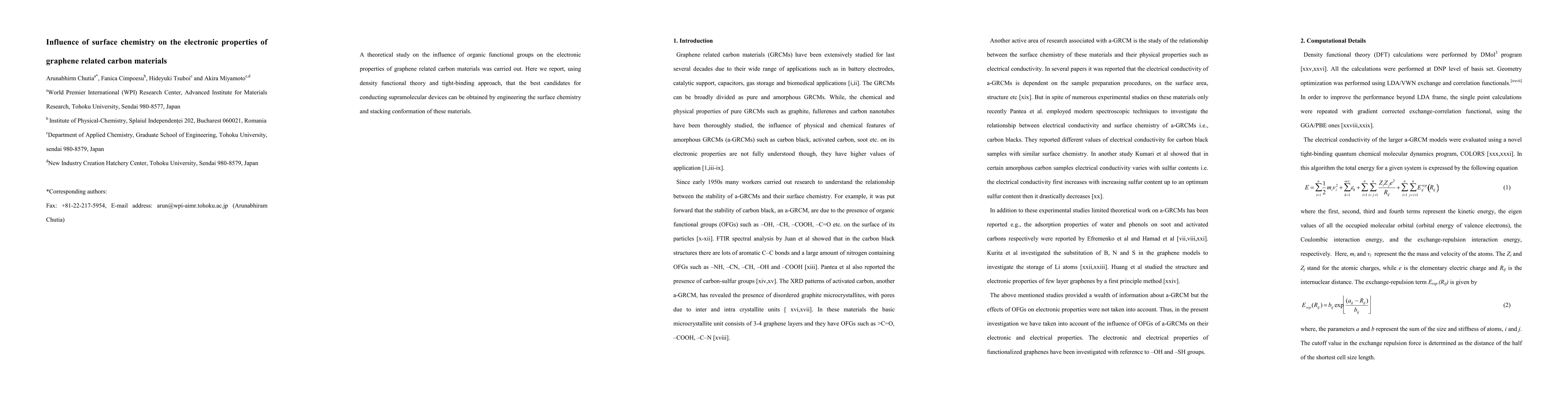 Summary: This theoretical study investigates how organic functional groups affect the electronic properties of graphene-related carbon materials, revealing that optimal candidates for conducting supramolecular devices can be achieved through precise surface chemistry and stacking conformation engineering.
