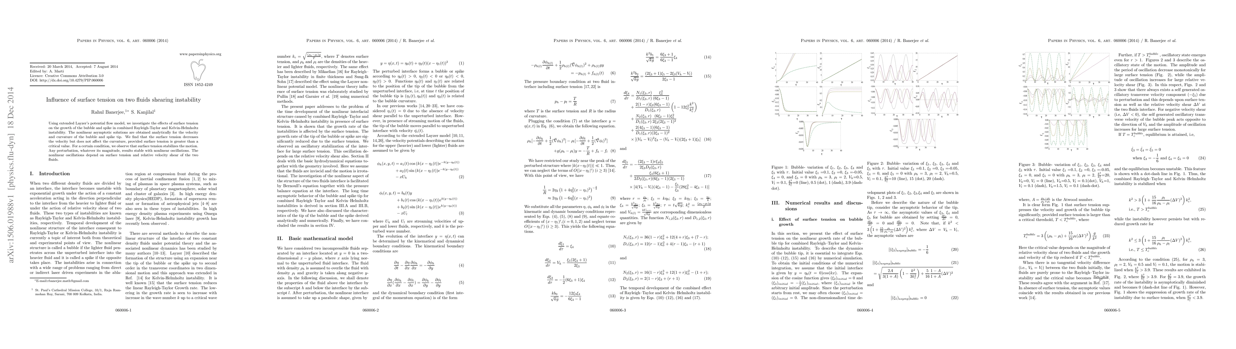 This study uses an extended Layzer's potential flow model to analyze how surface tension influences the growth of bubbles and spikes in combined Rayleigh-Taylor and Kelvin-Helmholtz instabilities. Surface tension is found to decrease velocity but not curvature, stabilizing the motion under certain conditions and causing nonlinear oscillations dependent on surface tension and relative velocity shear.