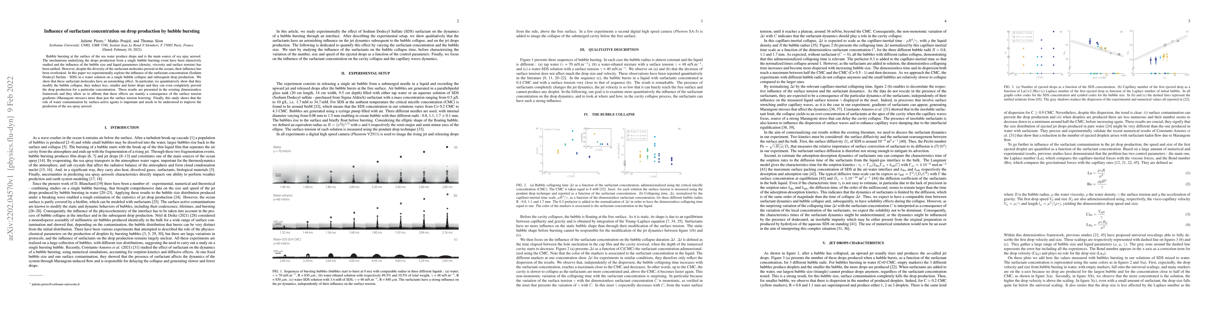 This paper experimentally investigates how varying concentrations of Sodium Dodecyl Surfate (SDS) in water affect drop production during bubble bursting, revealing that surfactants significantly modify bubble collapse, leading to smaller, faster drops, and can even prevent drop formation entirely, primarily due to surface tension gradients.