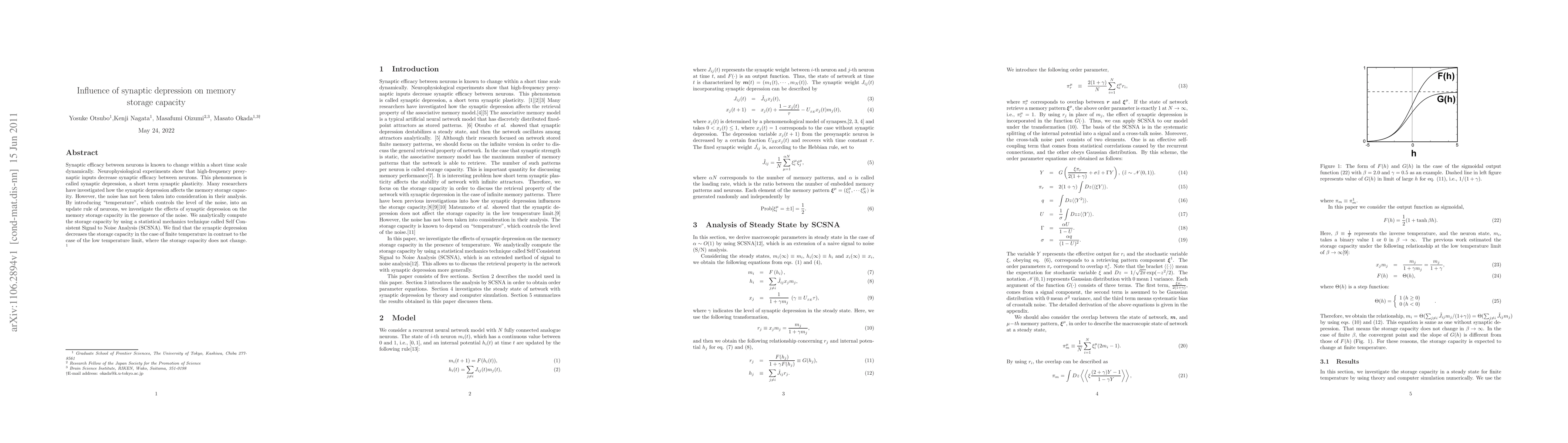 This paper investigates how synaptic depression affects memory storage capacity, considering noise through a temperature parameter. Using Self Consistent Signal to Noise Analysis, it finds that synaptic depression reduces storage capacity when noise is present, but not when noise is minimal.