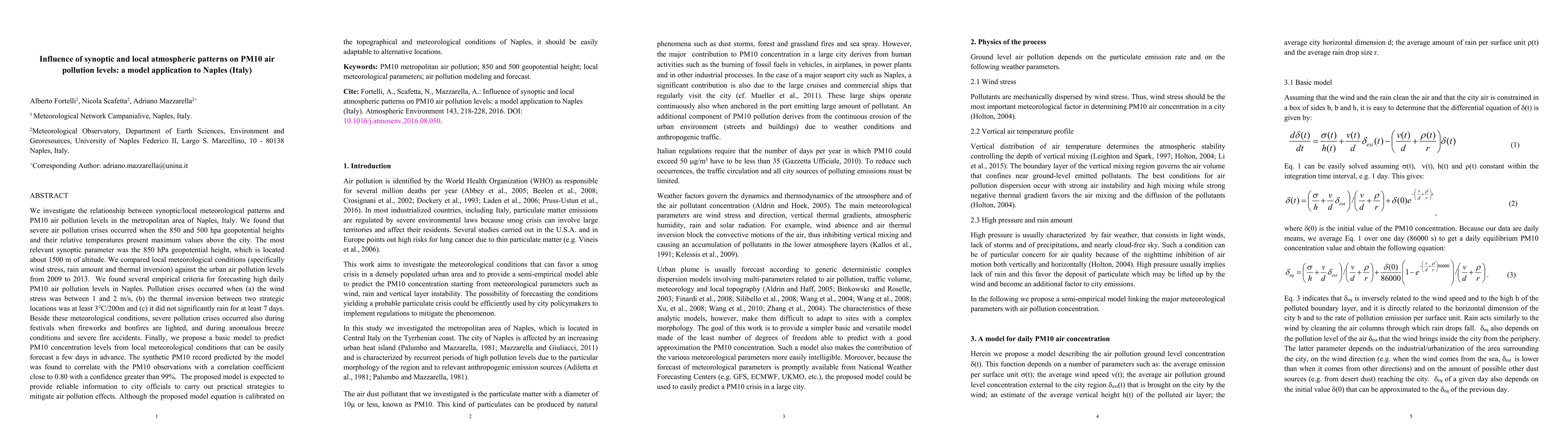 This study investigates the relationship between synoptic and local meteorological patterns and PM10 air pollution in Naples, Italy, identifying key factors like geopotential heights and thermal inversion. The model developed correlates well with observed PM10 levels, offering a reliable tool for forecasting and mitigating air pollution.