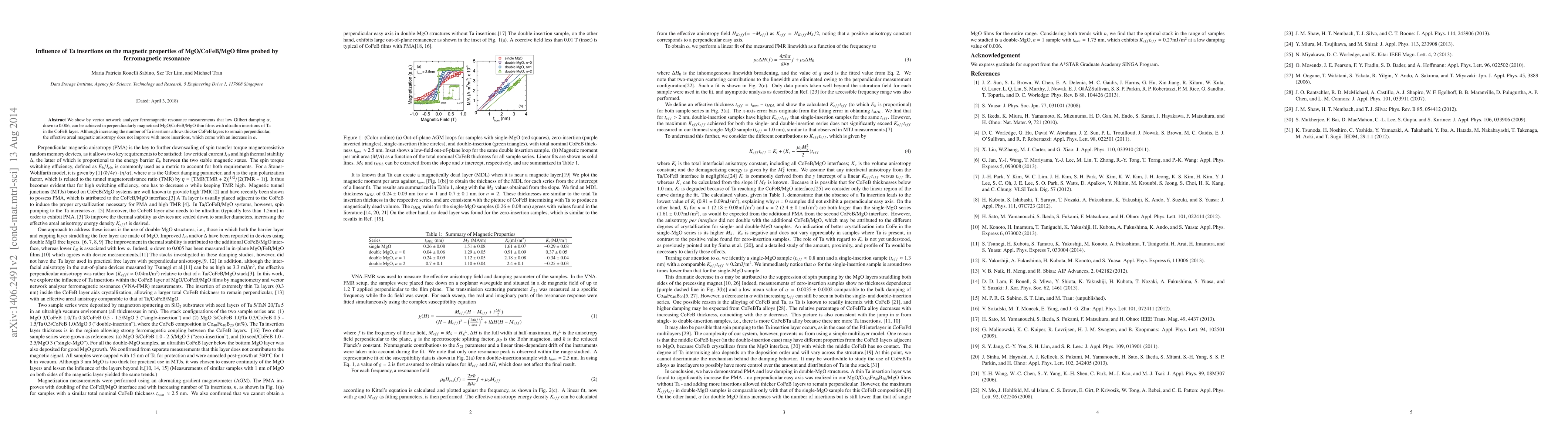 The paper presents a detailed analysis of magnetic properties in MgO/CoFeB/MgO films with Ta insertions using VNA-FMR, revealing the potential for low damping and PMA.