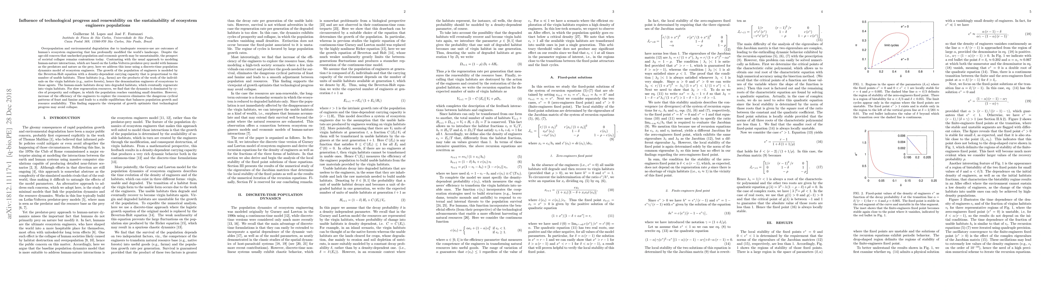 This paper explores the sustainability of ecosystem engineers' populations under technological progress and renewability, using a discrete-time population dynamics model. It finds that technological efficiency can stabilize population growth and resource use, countering cyclical patterns of collapse, thus supporting the optimistic view that technological advancements can avert societal collapse.