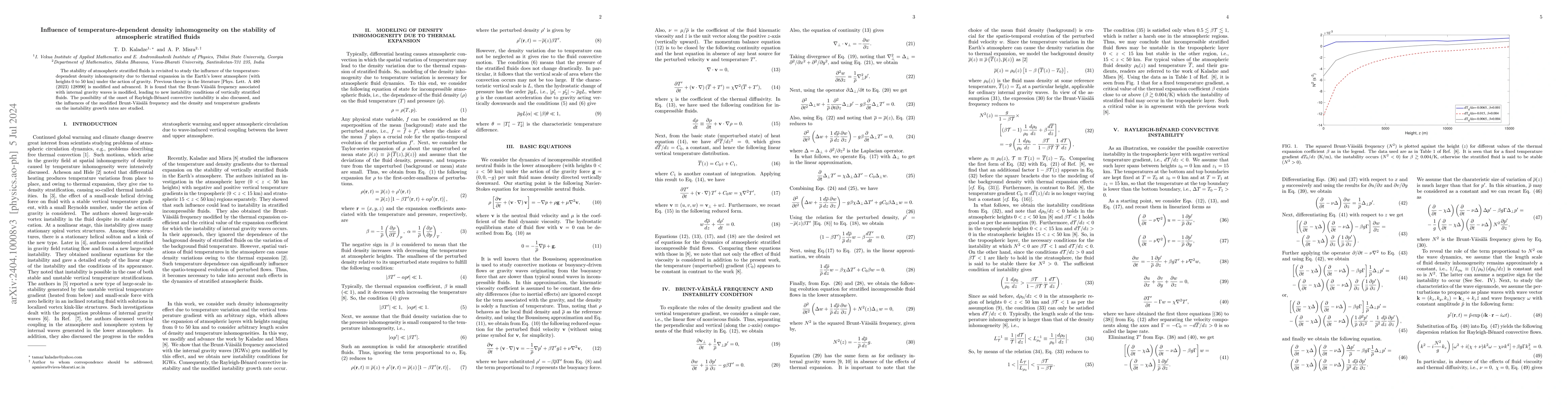 This paper modifies previous theories to investigate how temperature-dependent density inhomogeneity affects the stability of atmospheric stratified fluids. It reveals a modified Brunt-Väisälä frequency, leading to new instability conditions and the potential for Rayleigh-Bénard convective instability, with a focus on the influences of these factors on instability growth rates.