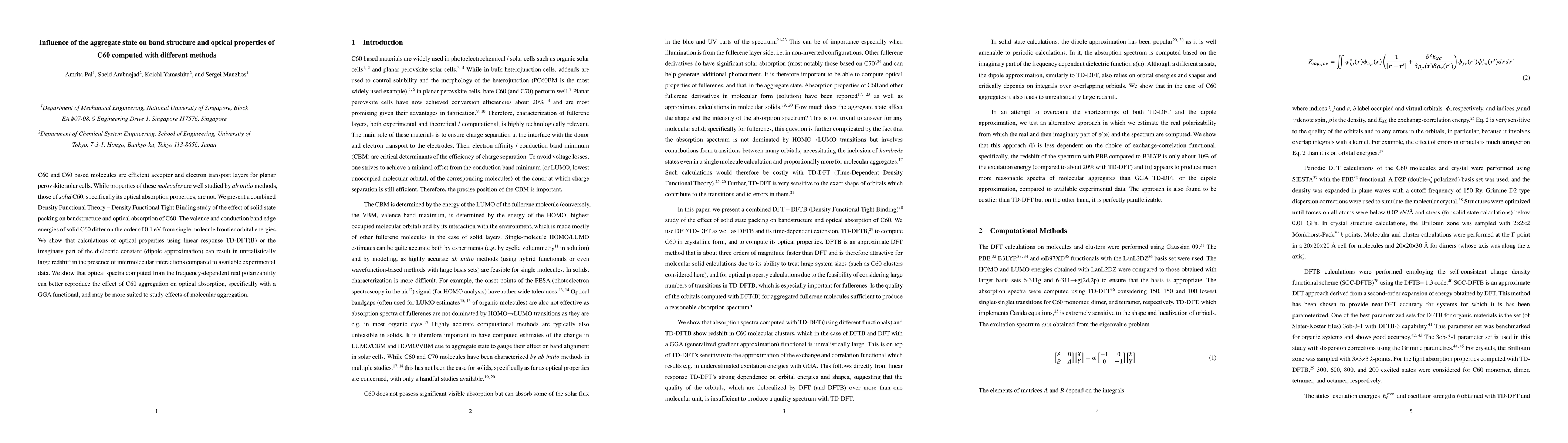 C60 and C60 based molecules are efficient acceptor and electron transport layers for planar perovskite solar cells. While properties of these molecules are well studied by ab initiomethods, those of solid C60, specifically its optical absorption properties, are not. We present a combined Density Functional Theory - Density Functional Tight Binding study of the effect of solid state packing on bandstructure and optical absorption of C60. The valence and conduction band edge energies of solid C60 differ on the order of 0.1 eV from single molecule frontier orbital energies. We show that calculations of optical properties using linear response TD-DFT(B) or the imaginary part of the dielectric constant (dipole approximation) can result in unrealistically large redshift in the presence of intermolecular interactions compared to available experimental data. We show that optical spectra computed from the frequency-dependent real polarizability better reproduce the effect of C60 aggregation on optical absorption and may be more suited to study effects of molecular aggregation.