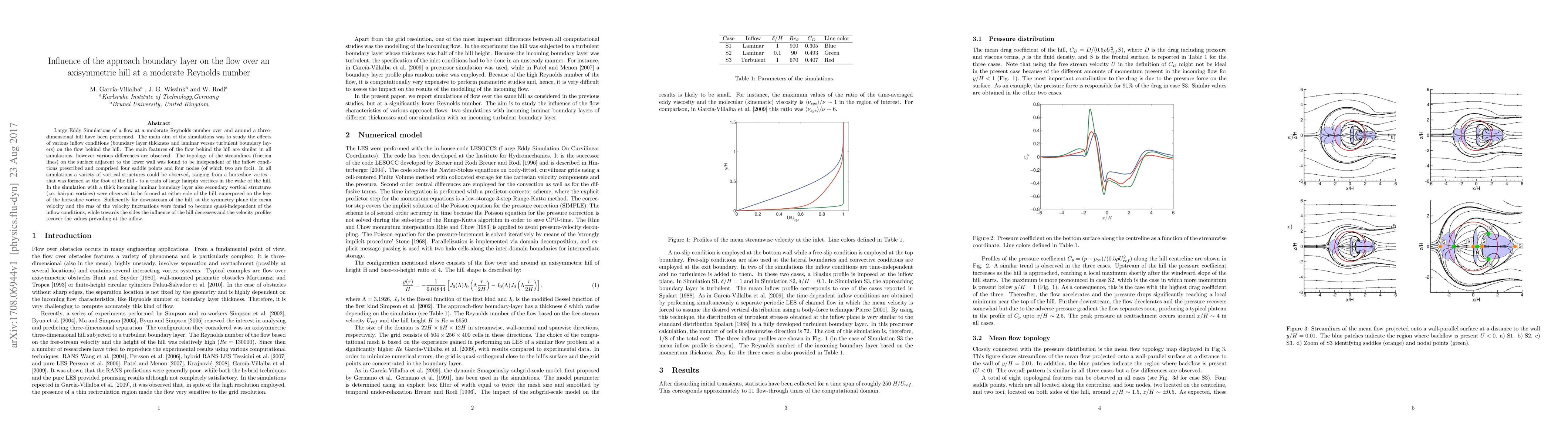 Large Eddy Simulations of a flow at a moderate Reynolds number over and around a three-dimensional hill have been performed. The main aim of the simulations was to study the effects of various inflow conditions (boundary layer thickness and laminar versus turbulent boundary layers) on the flow behind the hill. The main features of the flow behind the hill are similar in all simulations, however various differences are observed. The topology of the streamlines (friction lines) on the surface adjacent to the lower wall was found to be independent of the inflow conditions prescribed and comprised four saddle points and four nodes (of which two are foci). In all simulations a variety of vortical structures could be observed, ranging from a horseshoe vortex - that was formed at the foot of the hill - to a train of large hairpin vortices in the wake of the hill. In the simulation with a thick incoming laminar boundary layer also secondary vortical structures (i.e. hairpin vortices) were observed to be formed at either side of the hill, superposed on the legs of the horseshoe vortex. Sufficiently far downstream of the hill, at the symmetry plane the mean velocity and the rms of the velocity fluctuations were found to become quasi-independent of the inflow conditions, while towards the sides the influence of the hill decreases and the velocity profiles recover the values prevailing at the inflow.