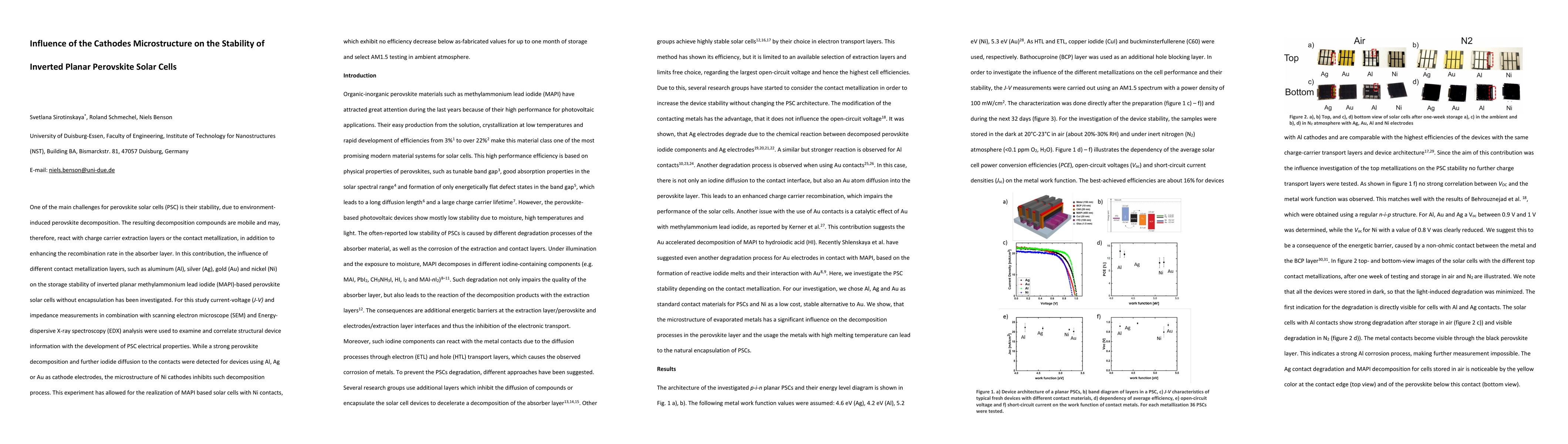 This study investigates how different cathode materials (Al, Ag, Au, Ni) affect the stability of inverted planar perovskite solar cells, finding that Ni cathodes significantly inhibit perovskite decomposition and iodide diffusion, resulting in stable performance over one month without encapsulation. SEM and EDX analyses correlated structural changes with electrical property degradation.