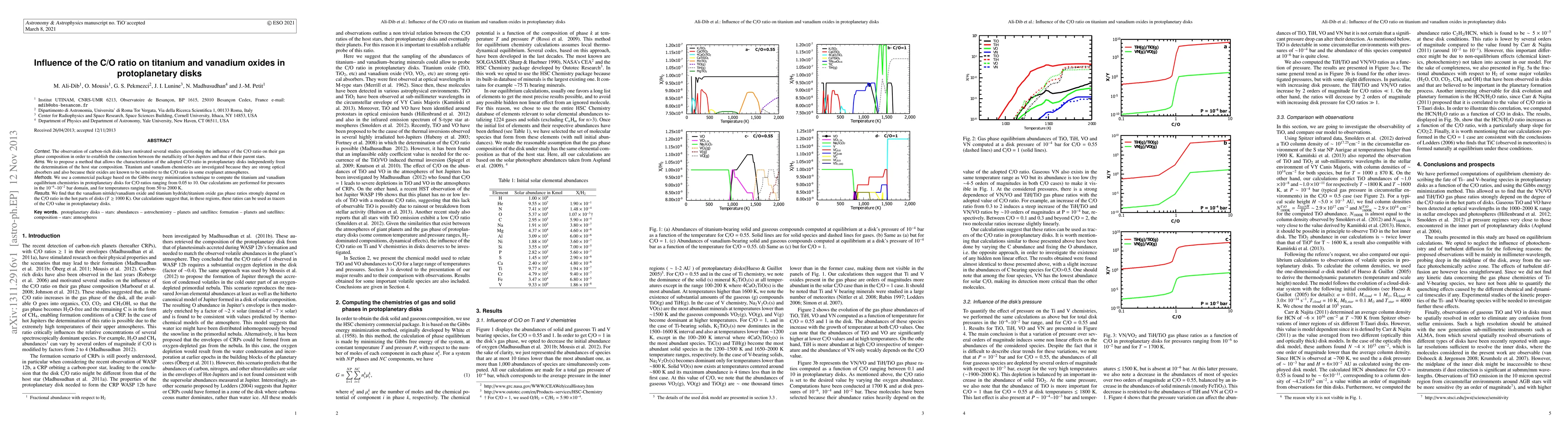 This paper investigates the influence of the carbon-to-oxygen (C/O) ratio on titanium and vanadium oxides in protoplanetary disks using Gibbs energy minimization techniques. The study finds that titanium and vanadium oxides' ratios are sensitive indicators of the C/O ratio in the hotter regions of these disks, suggesting they can characterize the C/O ratio independently of the host star's composition.