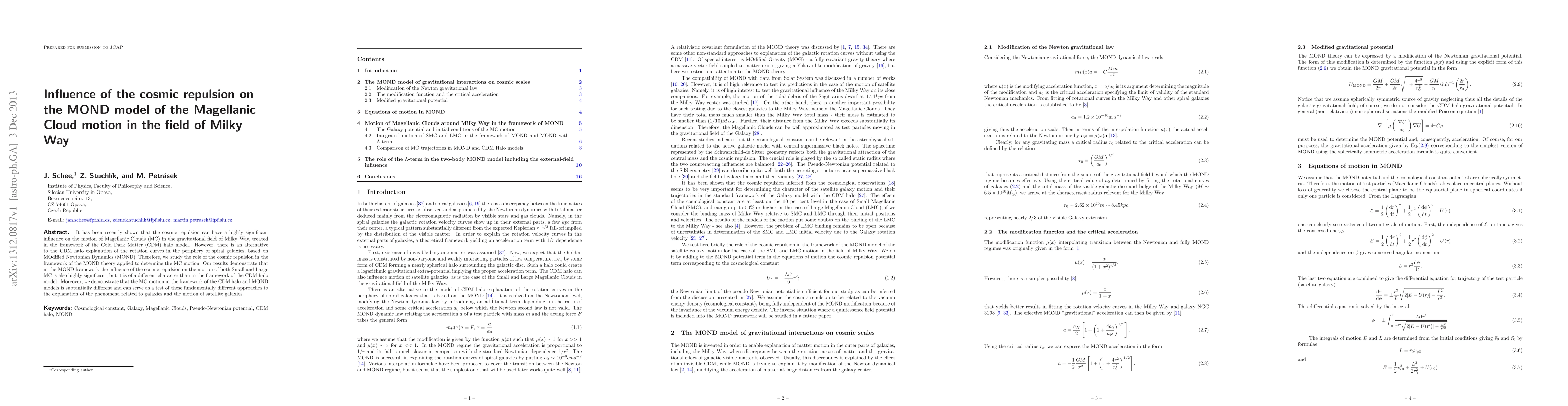 It has been recently shown that the cosmic repulsion can have a highly significant influence on the motion of Magellanic Clouds (MC) in the gravitational field of Milky Way, treated in the framework of the Cold Dark Matter (CDM) halo model. However, there is an alternative to the CDM halo explanation of the rotation curves in the periphery of spiral galaxies, based on MOdified Newtonian Dynamics (MOND). Therefore, we study the role of the cosmic repulsion in the framework of the MOND theory applied to determine the MC motion. Our results demonstrate that in the MOND framework the influence of the cosmic repulsion on the motion of both Small and Large MC is also highly significant, but it is of a different character than in the framework of the CDM halo model. Moreover, we demonstrate that the MC motion in the framework of the CDM halo and MOND models is subtantially different and can serve as a test of these fundamentally different approaches to the explanation of the phenomena related to galaxies and the motion of satellite galaxies.