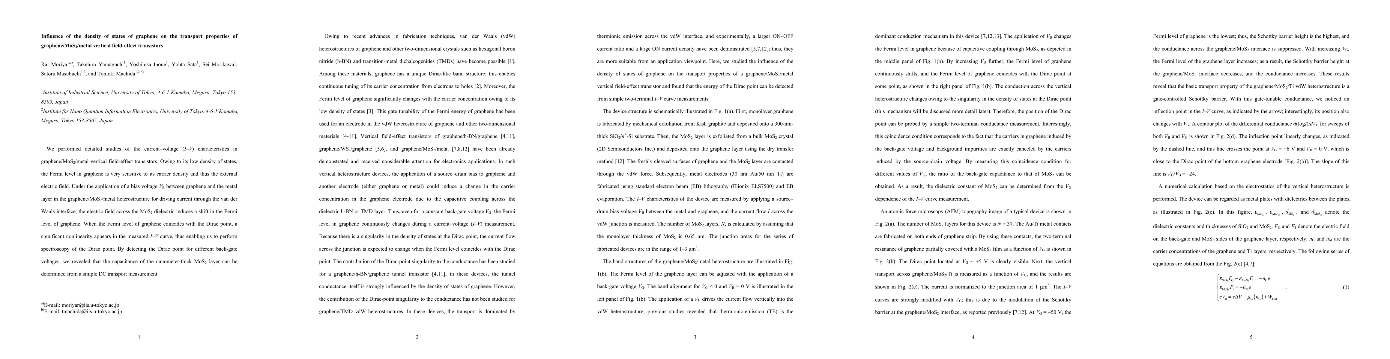 This study investigates the current-voltage behavior in graphene/MoS2/metal vertical FETs, showing that the low density of states in graphene makes its Fermi level highly responsive to carrier density and electric fields. The shift in graphene's Fermi level at the Dirac point due to the electric field across MoS2 reveals nonlinearities in the I-V curve, allowing for spectroscopy of the Dirac point and determination of MoS2 capacitance via DC transport measurements.