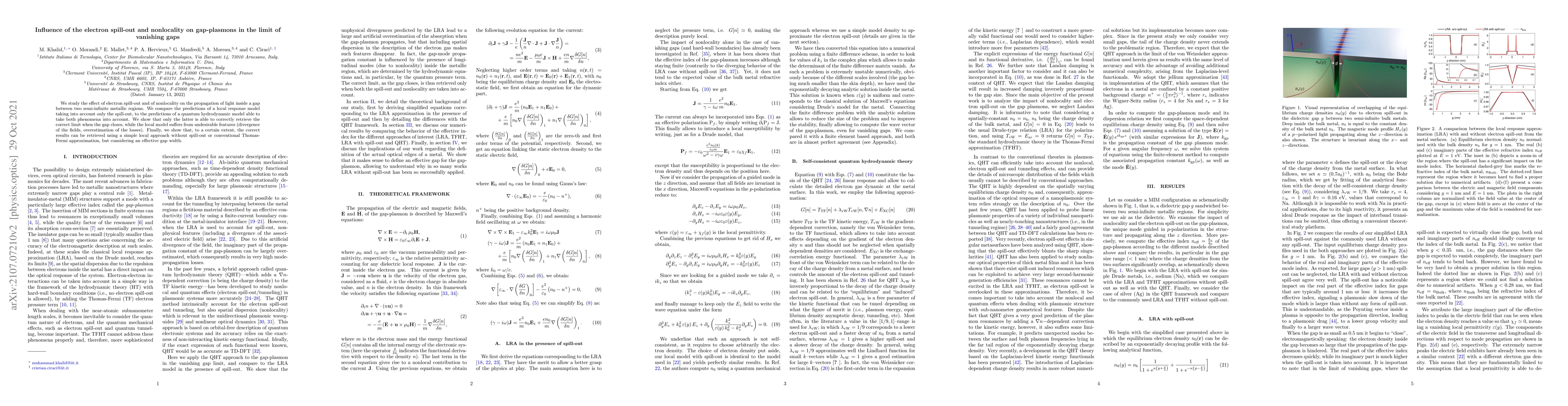 We study the effect of electron spill-out and of nonlocality on the propagation of light inside a gap between two semi-infinite metallic regions. We compare the predictions of a local response model taking into account only the spill-out, to the predictions of a quantum hydrodynamic model able to take both phenomena into account. We show that only the latter is able to correctly retrieve the correct limit when the gap closes, while the local model suffers from undesirable features (divergence of the fields, overestimation of the losses). Finally, we show that, to a certain extent, the correct results can be retrieved using a simple local approach without spill-out or conventional Thomas-Fermi approximation, but considering an effective gap width.