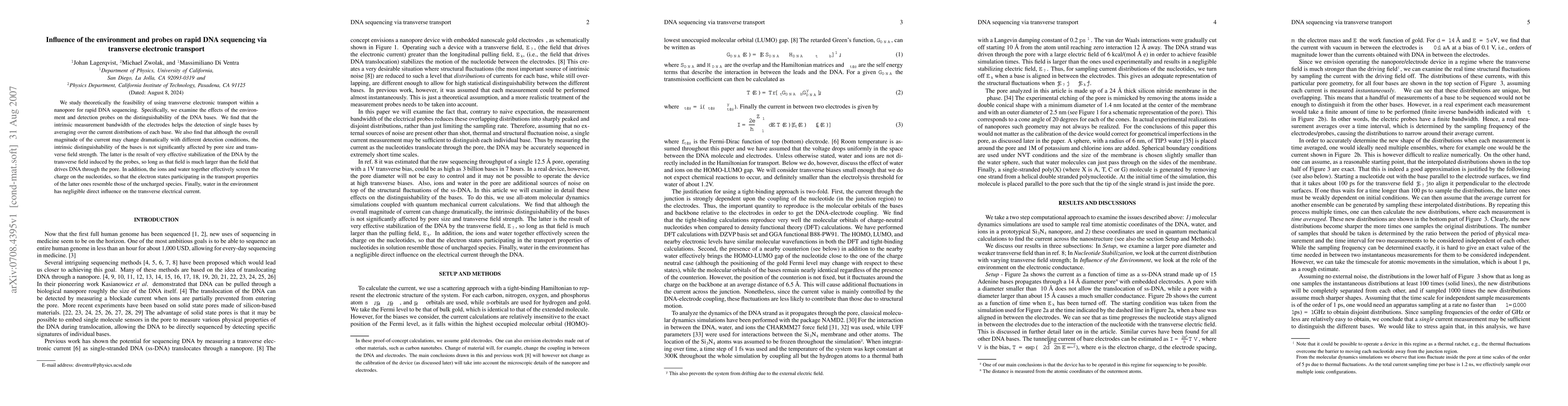 This paper explores the potential of using transverse electronic transport in nanopores for rapid DNA sequencing, finding that intrinsic measurement bandwidth aids in base detection. It also concludes that the distinguishability of DNA bases remains stable despite variations in pore size and field strength, primarily due to effective stabilization by the transverse field induced by probes.