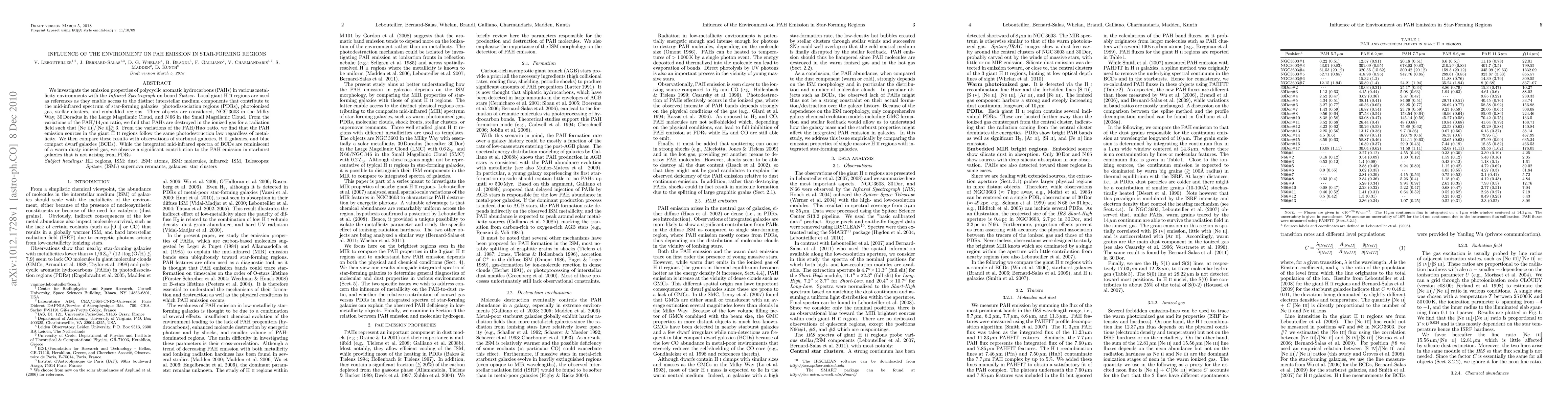 This study examines PAH emissions in star-forming regions across different metallicity environments using Spitzer's Infrared Spectrograph. It finds that PAHs are destroyed in ionized gas under high radiation fields, and PAH emission in giant HII regions follows a consistent photodestruction law irrespective of metallicity.