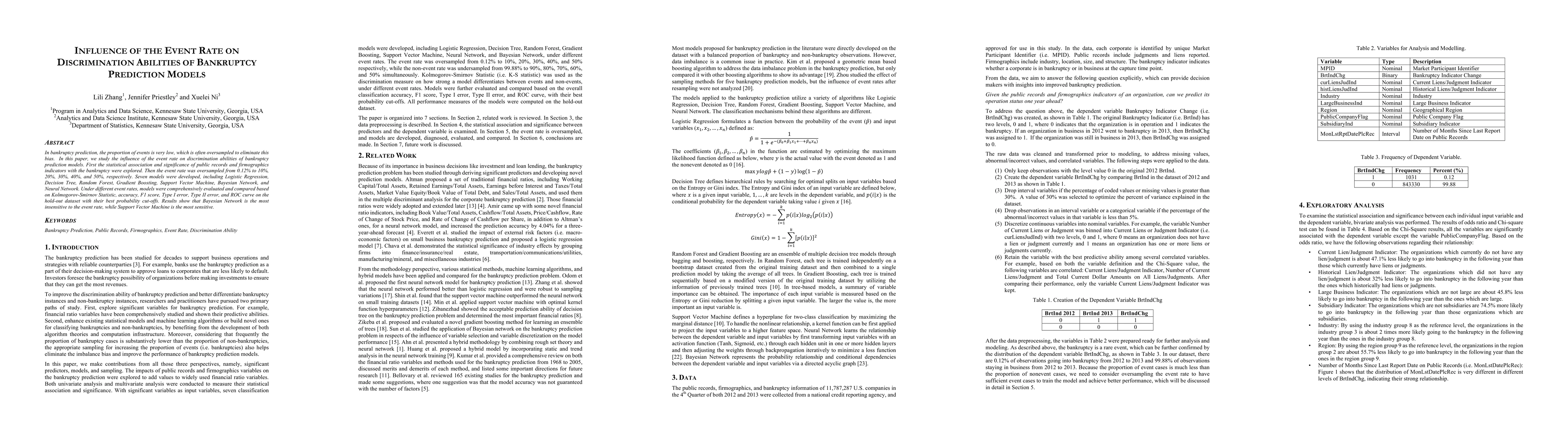 In bankruptcy prediction, the proportion of events is very low, which is often oversampled to eliminate this bias. In this paper, we study the influence of the event rate on discrimination abilities of bankruptcy prediction models. First the statistical association and significance of public records and firmographics indicators with the bankruptcy were explored. Then the event rate was oversampled from 0.12% to 10%, 20%, 30%, 40%, and 50%, respectively. Seven models were developed, including Logistic Regression, Decision Tree, Random Forest, Gradient Boosting, Support Vector Machine, Bayesian Network, and Neural Network. Under different event rates, models were comprehensively evaluated and compared based on Kolmogorov-Smirnov Statistic, accuracy, F1 score, Type I error, Type II error, and ROC curve on the hold-out dataset with their best probability cut-offs. Results show that Bayesian Network is the most insensitive to the event rate, while Support Vector Machine is the most sensitive.