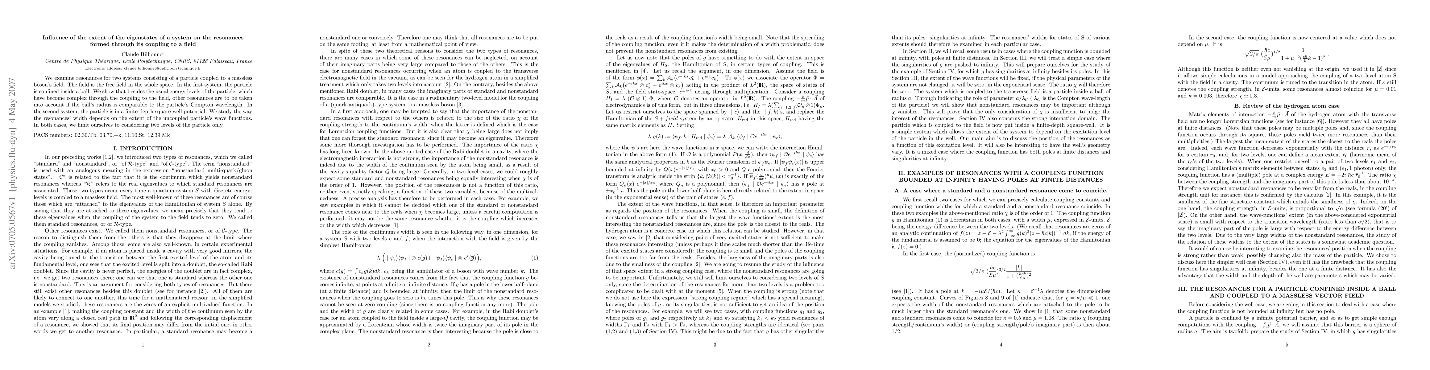 We examine resonances for two systems consisting of a particle coupled to a massless boson's field. The field is the free field in the whole space. In the first system, the particle is confined inside a ball. We show that besides the usual energy levels of the particle, which have become complex through the coupling to the field, other resonances are to be taken into account if the ball's radius is comparable to the particle's Compton wavelength. In the second system, the particle is in a finite-depth square-well potential. We study the way the resonances' width depends on the extent of the uncoupled particle's wave functions. In both cases, we limit ourselves to considering two levels of the particle only.