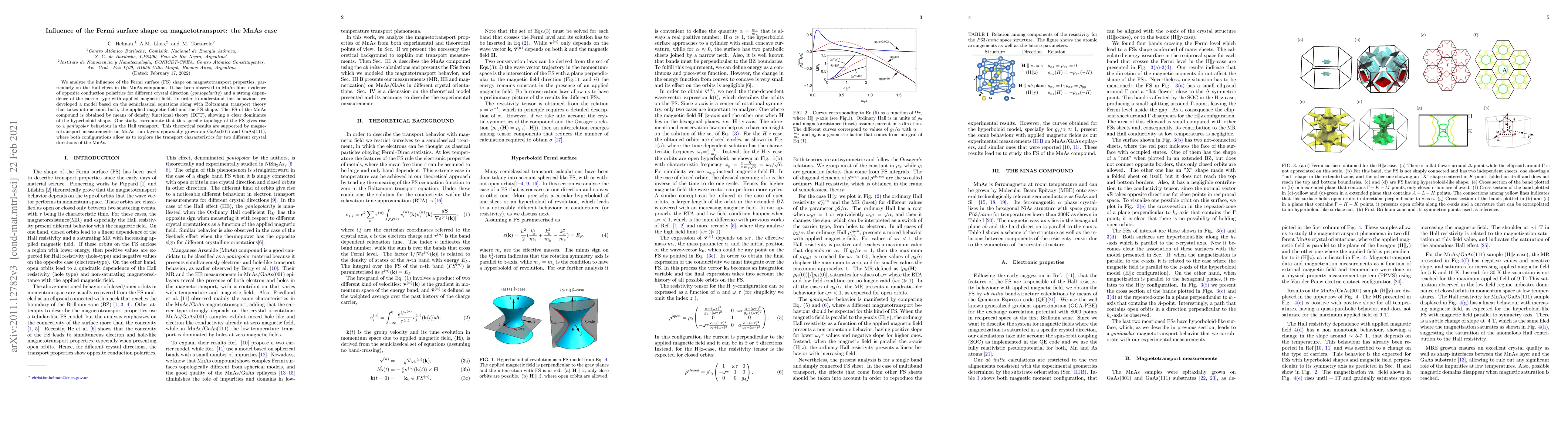 This paper investigates how the Fermi surface shape of MnAs influences its magnetotransport properties, particularly the Hall effect, revealing goniopolarity and carrier type dependence on the magnetic field. The study combines semiclassical equations, Boltzmann transport theory, and density functional theory to model the hyperboloid-shaped Fermi surface, confirming its role in the observed goniopolar Hall transport behavior, supported by experimental measurements on MnAs thin layers.