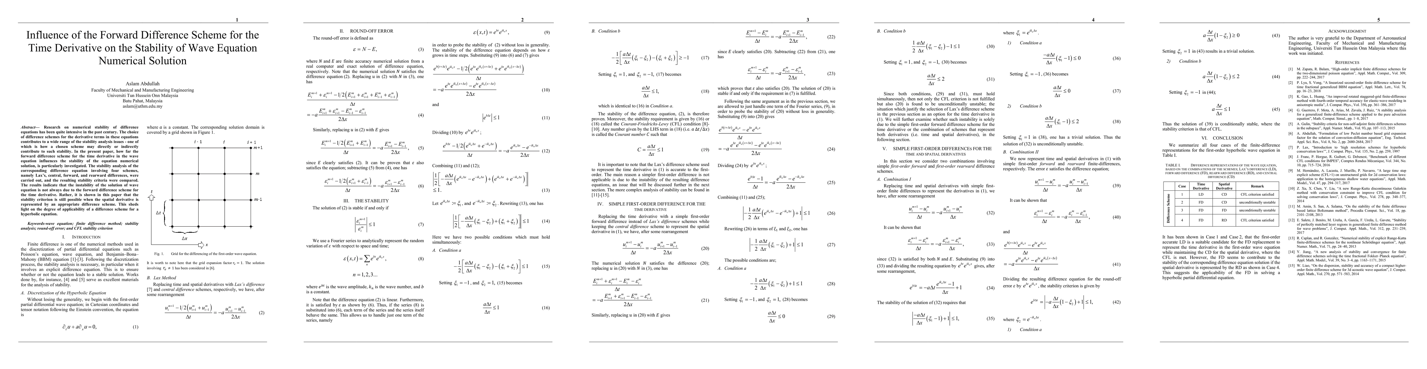 Research on numerical stability of difference equations has been quite intensive in the past century. The choice of difference schemes for the derivative terms in these equations contributes to a wide range of the stability analysis issues - one of which is how a chosen scheme may directly or indirectly contribute to such stability. In the present paper, how far the forward difference scheme for the time derivative in the wave equation influences the stability of the equation numerical solution, is particularly investigated. The stability analysis of the corresponding difference equation involving four schemes, namely Lax's, central, forward, and rearward differences, were carried out, and the resulting stability criteria were compared. The results indicate that the instability of the solution of wave equation is not always due to the forward difference scheme for the time derivative. Rather, it is shown in this paper that the stability criterion is still possible when the spatial derivative is represented by an appropriate difference scheme. This sheds light on the degree of applicability of a difference scheme for a hyperbolic equation.