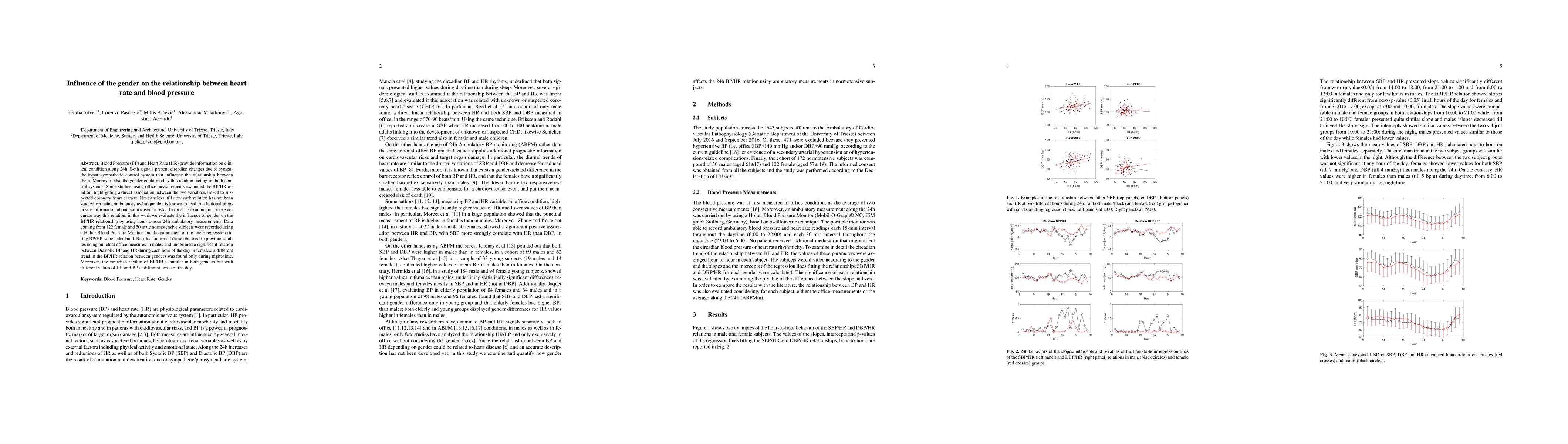 Blood Pressure (BP) and Heart Rate (HR) provide information on clin-ical condition along 24h. Both signals present circadian changes due to sympa-thetic/parasympathetic control system that influence the relationship between them. Moreover, also the gender could modify this relation, acting on both con-trol systems. Some studies, using office measurements examined the BP/HR re-lation, highlighting a direct association between the two variables, linked to sus-pected coronary heart disease. Nevertheless, till now such relation has not been studied yet using ambulatory technique that is known to lead to additional prog-nostic information about cardiovascular risks. In order to examine in a more ac-curate way this relation, in this work we evaluate the influence of gender on the BP/HR relationship by using hour-to-hour 24h ambulatory measurements. Data coming from 122 female and 50 male normotensive subjects were recorded using a Holter Blood Pressure Monitor and the parameters of the linear regression fit-ting BP/HR were calculated. Results confirmed those obtained in previous stud-ies using punctual office measures in males and underlined a significant relation between Diastolic BP and HR during each hour of the day in females; a different trend in the BP/HR relation between genders was found only during night-time. Moreover, the circadian rhythm of BP/HR is similar in both genders but with different values of HR and BP at different times of the day.