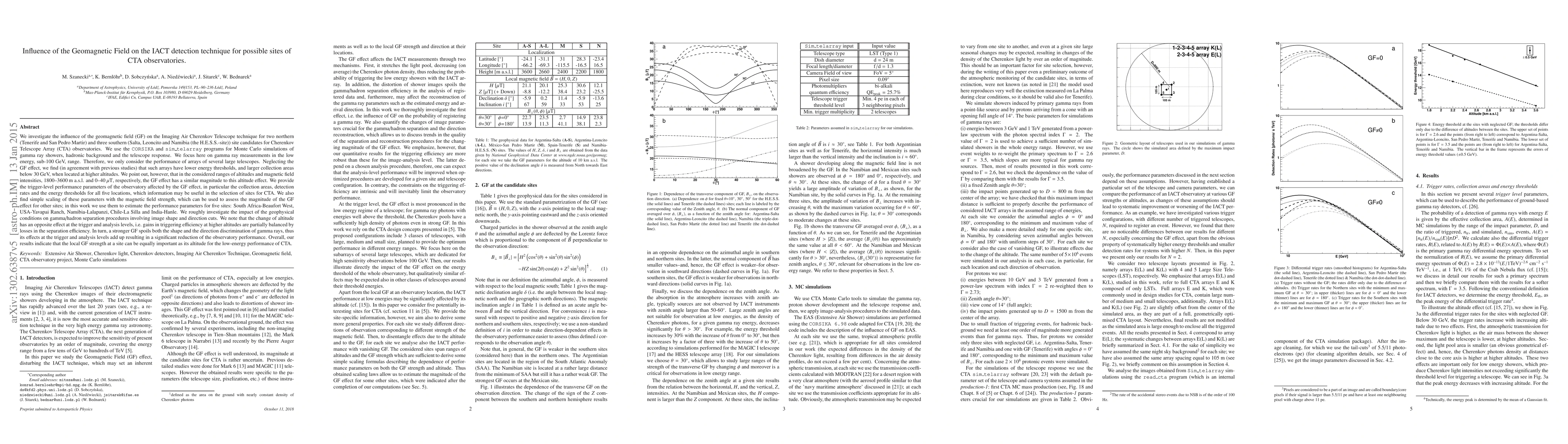 We investigate the influence of the geomagnetic field (GF) on the Imaging Air Cherenkov Telescope technique for two northern (Tenerife and San Pedro Martir) and three southern (Salta, Leoncito and Namibia (the H.E.S.S.-site)) site candidates for Cherenkov Telescope Array (CTA) observatories. We use the CORSIKA and sim_telarray programs for Monte Carlo simulations of gamma ray showers, hadronic background and the telescope response. We focus here on gamma ray measurements in the low energy, sub-100 GeV, range. Therefore, we only consider the performance of arrays of several large telescopes. Neglecting the GF effect, we find (in agreement with previous studies) that such arrays have lower energy thresholds, and larger collection areas below 30 GeV, when located at higher altitudes. We point out, however, that in the considered ranges of altitudes and magnetic field intensities, 1800-3600 m a.s.l. and 0-40 uT, respectively, the GF effect has a similar magnitude to this altitude effect. We provide the trigger-level performance parameters of the observatory affected by the GF effect, in particular the collection areas, detection rates and the energy thresholds for all five locations, which information may be useful in the selection of sites for CTA. We also find simple scaling of these parameters with the magnetic field strength, which can be used to assess the magnitude of the GF effect for other sites; in this work we use them to estimate the performance parameters for five sites: South Africa-Beaufort West, USA-Yavapai Ranch, Namibia-Lalapanzi, Chile-La Silla and India-Hanle. We roughly investigate the impact of the geophysical conditions on gamma/hadron separation procedures involving image shape and direction cuts.