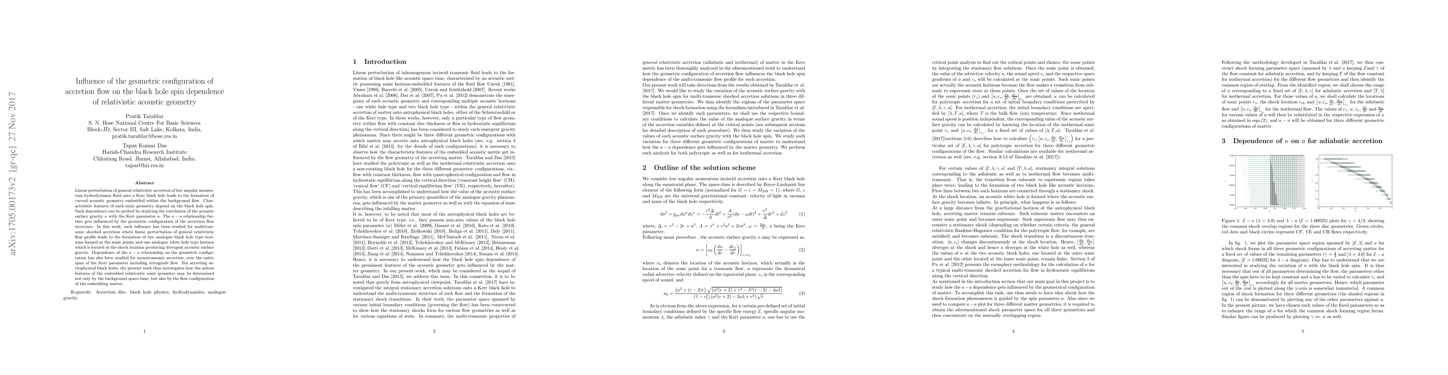 Linear perturbation of general relativistic accretion of low angular momentum hydrodynamic fluid onto a Kerr black hole leads to the formation of curved acoustic geometry embedded within the background flow. Characteristic features of such sonic geometry depend on the black hole spin. Such dependence can be probed by studying the correlation of the acoustic surface gravity $\kappa$ with the Kerr parameter $a$. The $\kappa - a$ relationship further gets influenced by the geometric configuration of the accretion flow structure. In this work, such influence has been studied for multitransonic shocked accretion where linear perturbation of general relativistic flow profile leads to the formation of two analogue black hole type horizons formed at the sonic points and one analogue white hole type horizon which is formed at the shock location producing divergent acoustic surface gravity. Dependence of the $\kappa - a$ relationship on the geometric configuration has also been studied for monotransonic accretion, over the entire span of the Kerr parameter including retrograde flow. For accreting astrophysical black holes, the present work thus investigates how the salient features of the embedded relativistic sonic geometry may be determined not only by the background space-time, but also by the flow configuration of the embedding matter.