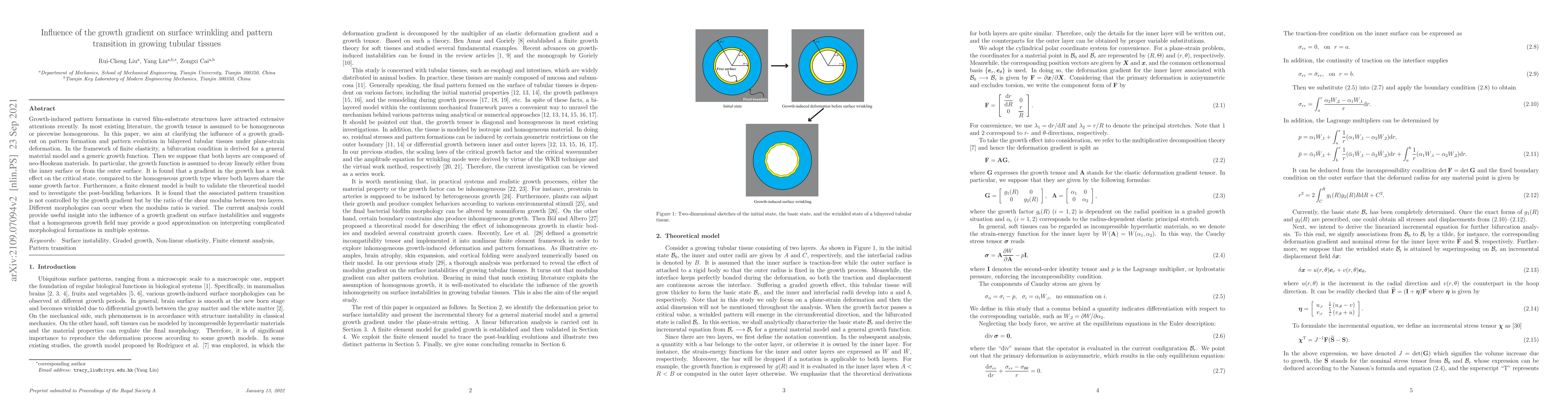 A study investigates how a growth gradient affects pattern formation in growing tubular tissues under deformation, finding that its impact is relatively weak compared to homogeneous growth, and that the ratio of shear moduli between layers determines morphological transitions.