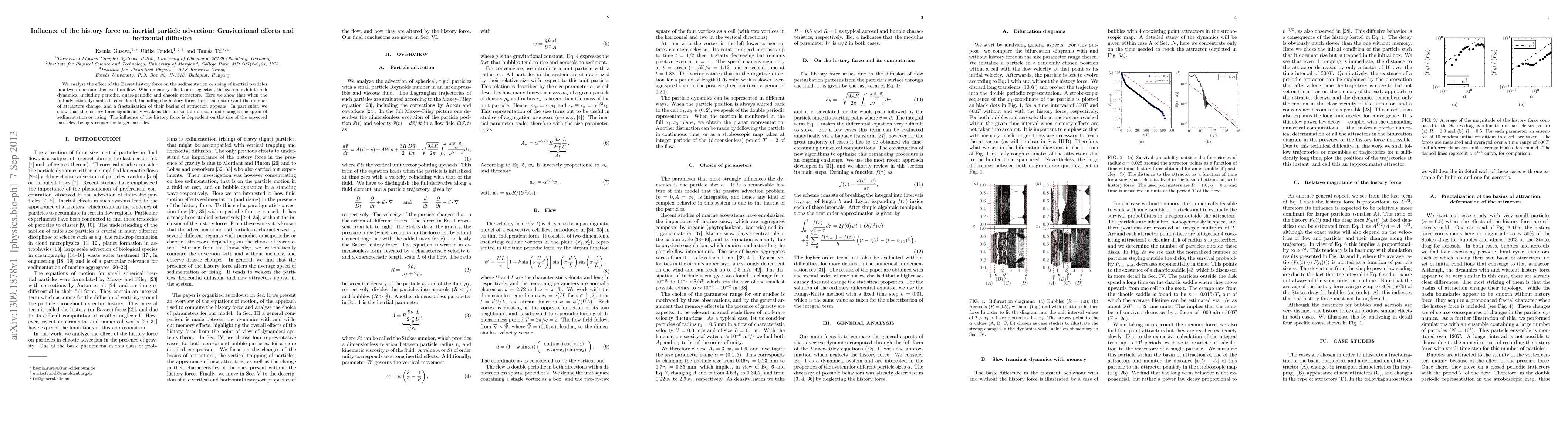 This paper investigates the impact of the Basset history force on inertial particle dynamics in a two-dimensional convection flow, revealing that it alters the nature and number of attractors and introduces fractalization in their basins of attraction. The history force notably reduces horizontal diffusion and modifies the sedimentation or rising speed, with its effect being more pronounced for larger particles.