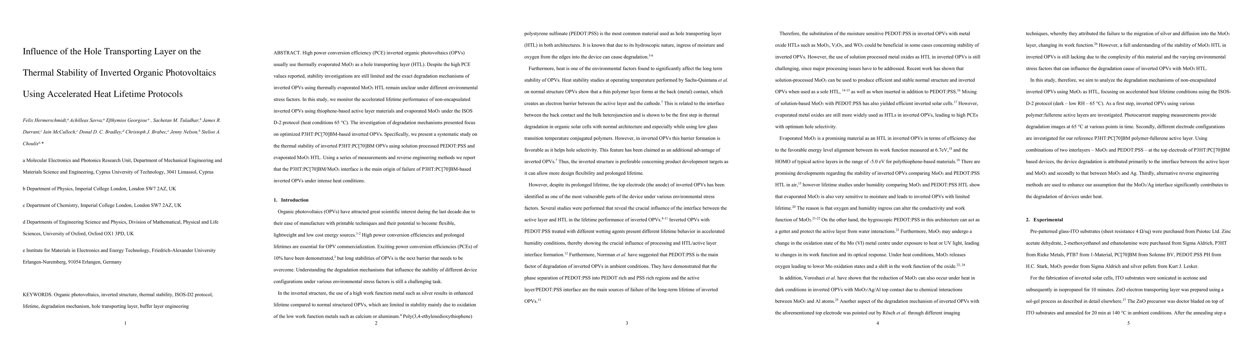 This study investigates the thermal stability of inverted organic photovoltaics (OPVs) using thermally evaporated MoO3 as a hole transporting layer (HTL) under accelerated heat conditions. Results show that the P3HT:PC[70]BM/MoO3 interface is the primary site of failure, highlighting the need for improved thermal stability in these materials.